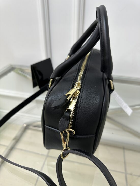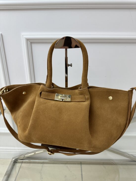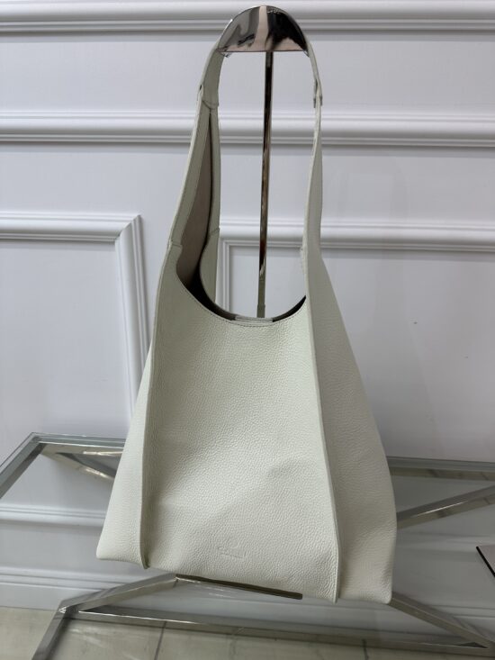 Skórzana torebka na ramię w kolorze jasnego beżu.