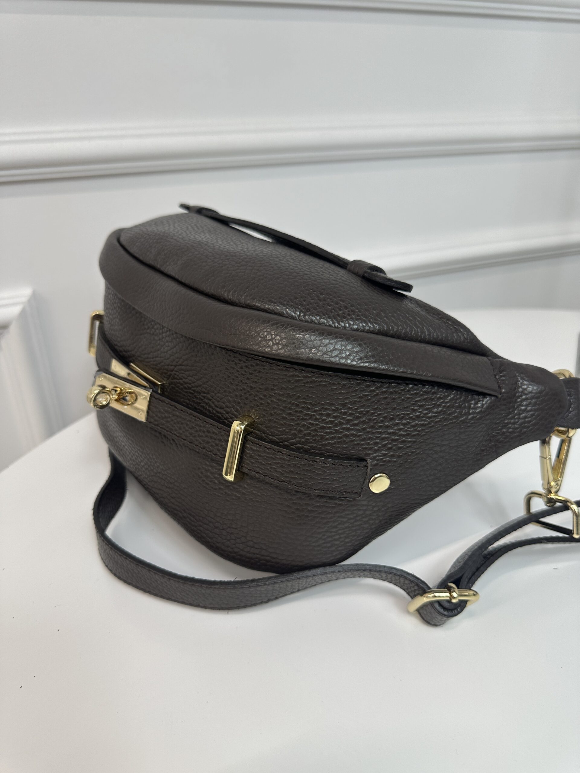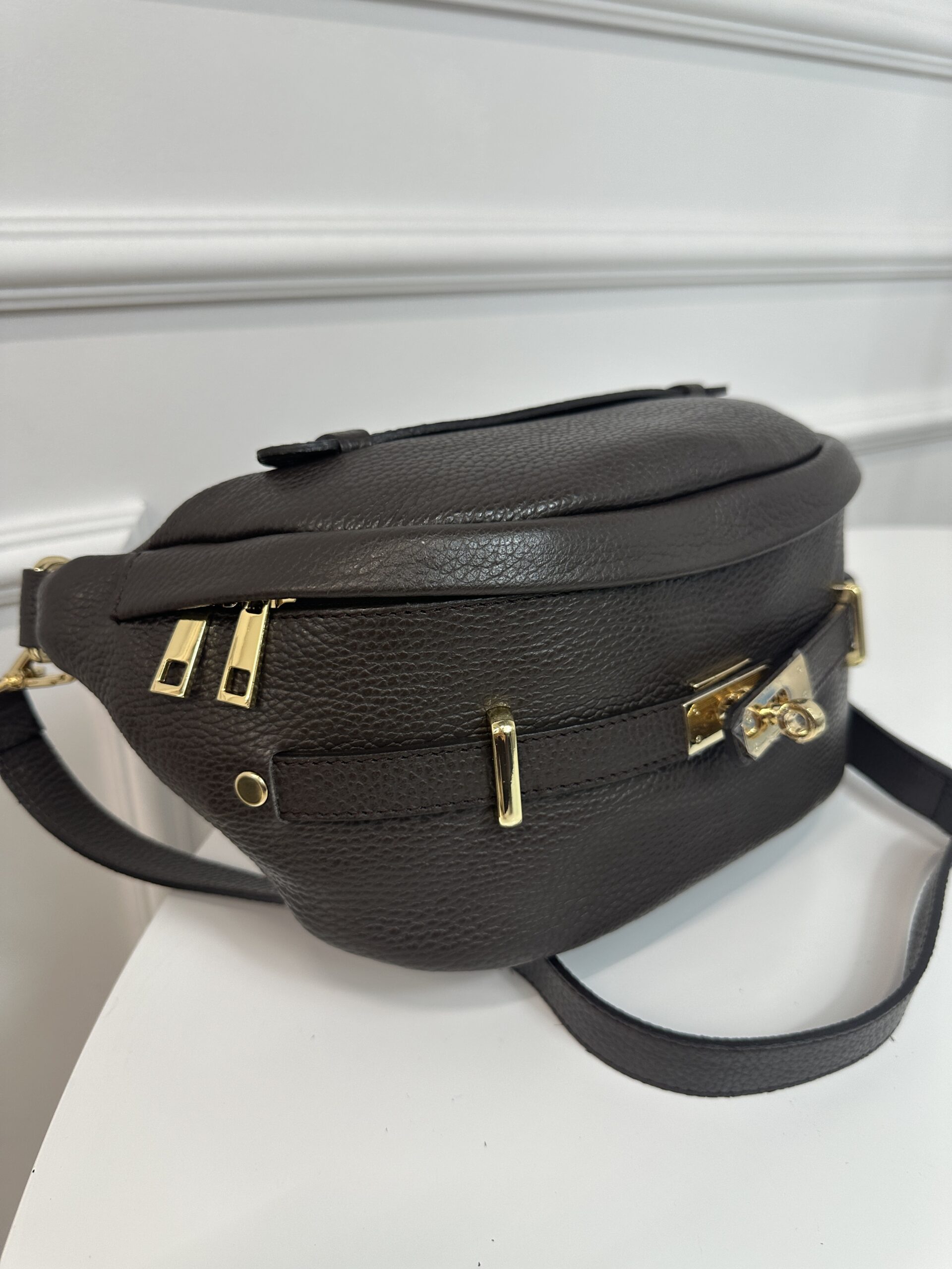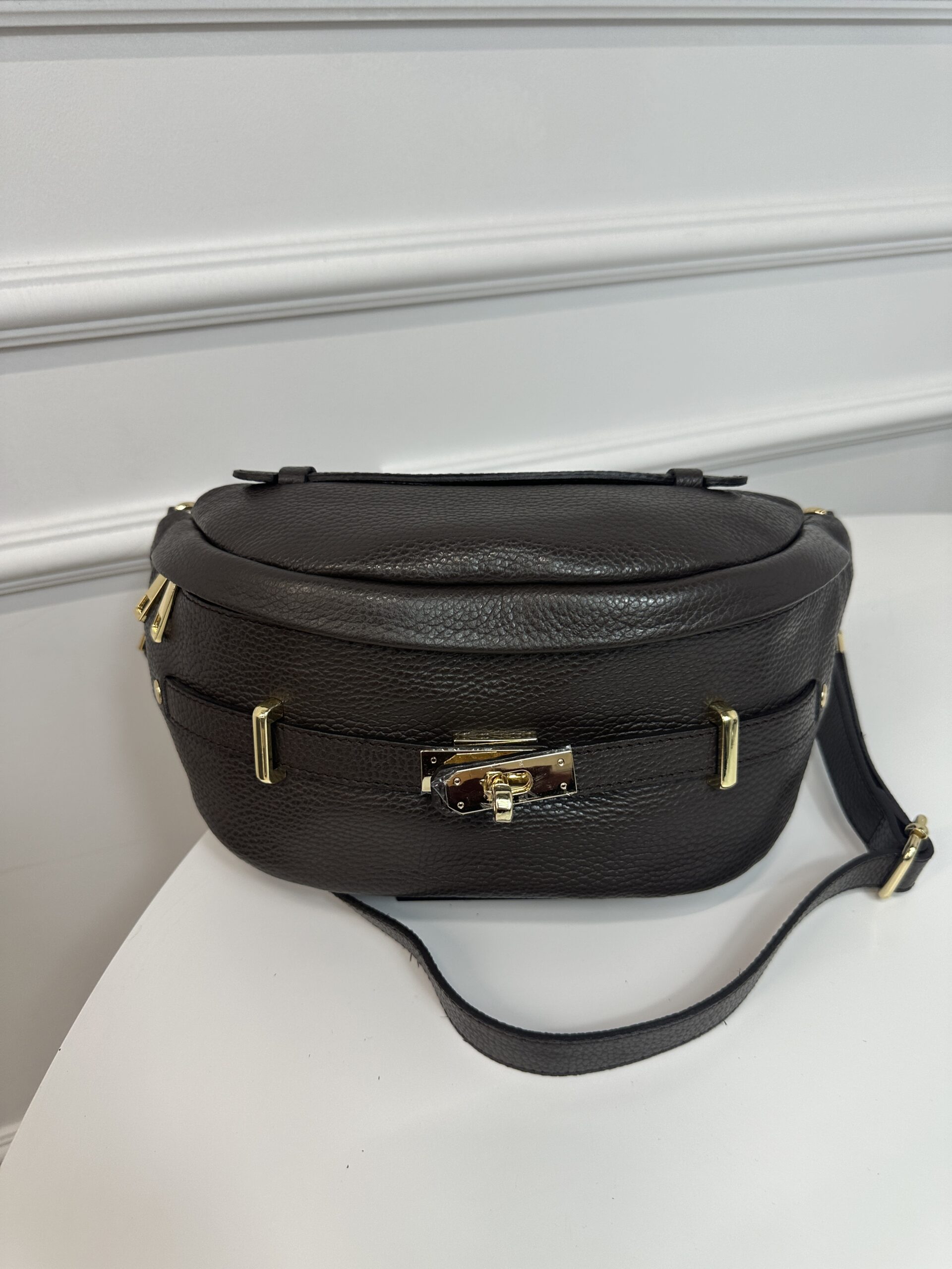 Torebka typu nerka wykonana ze skóry groszkowej w kolorze brązowym . Wewnątrz znajdują się dodatkowo kieszonka zapinana na suwak. Nerka posiada skórzany pasek z regulacją długości , okucia w kolorze złotym. Oryginalności dodaje biżuteryjne złote zapięcie na przodzie Nerka jest niezwykle pojemna i wygodna, można ją nosić do sportowych stylizacji jak i na skos tak jak listonoszkę.