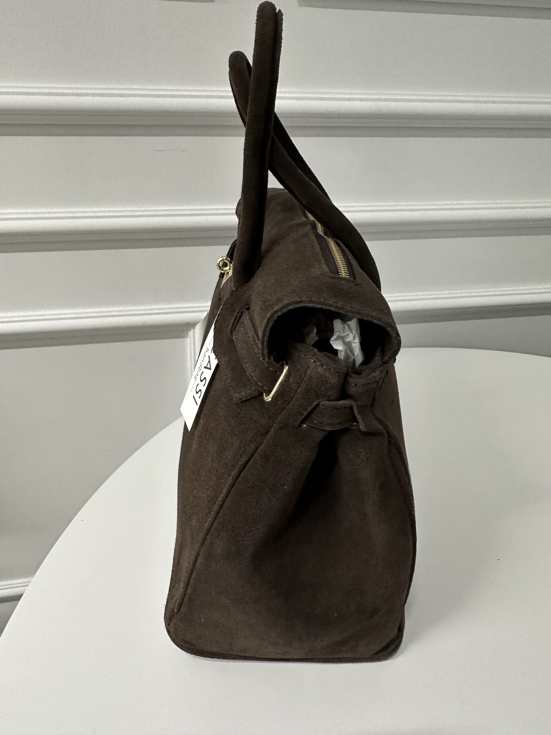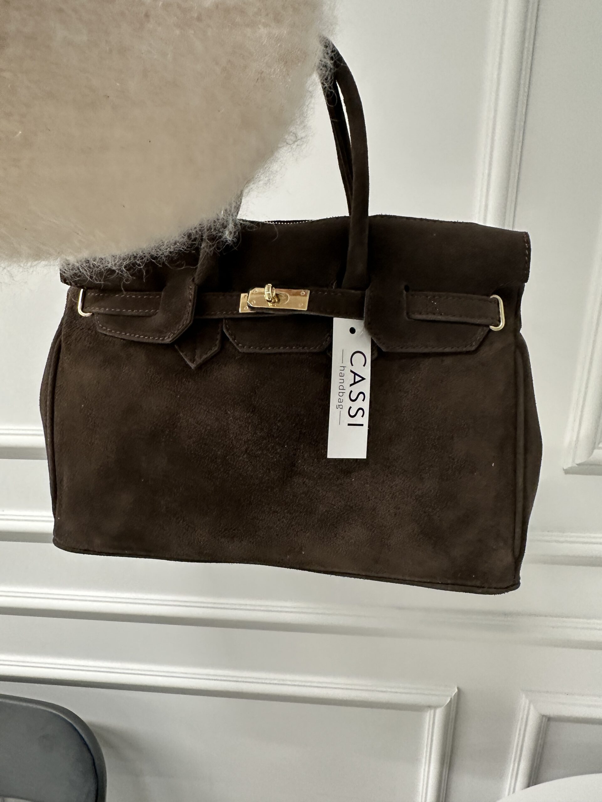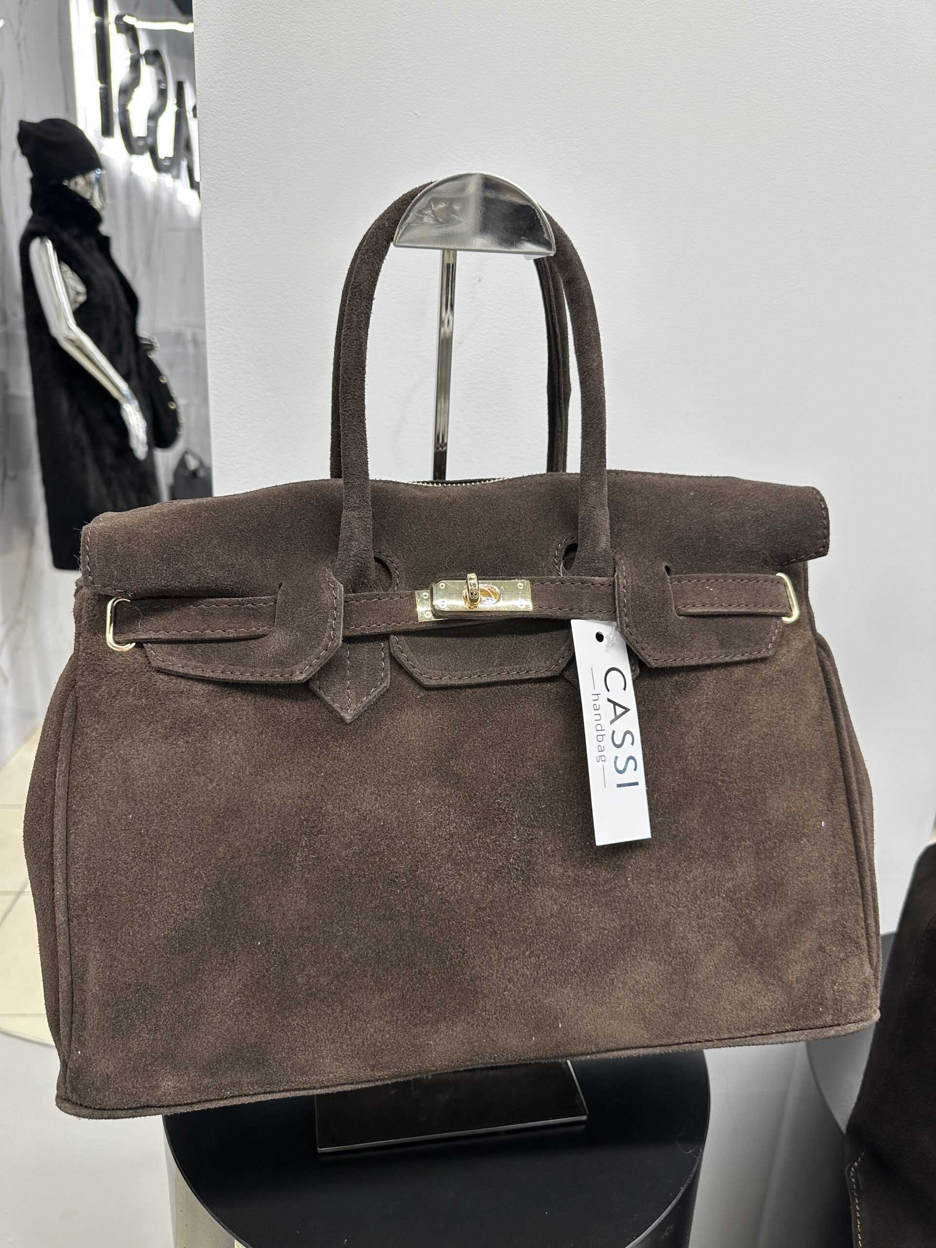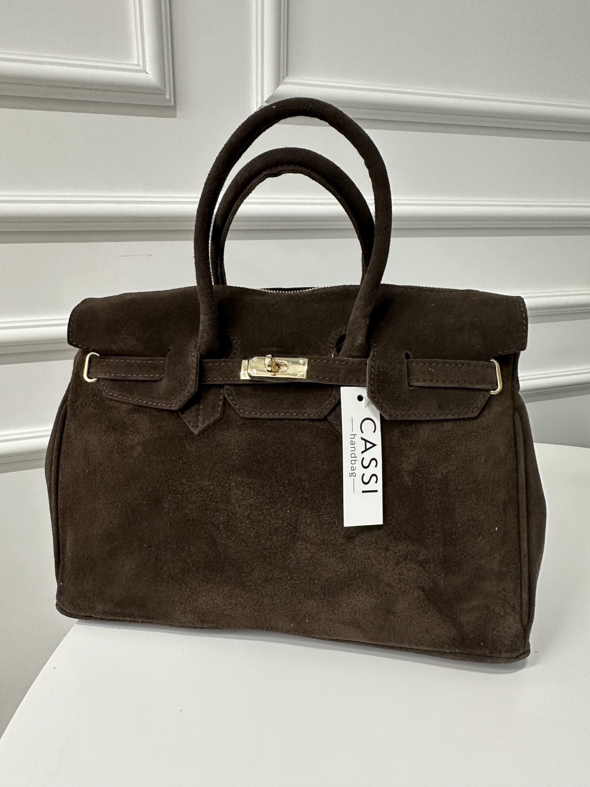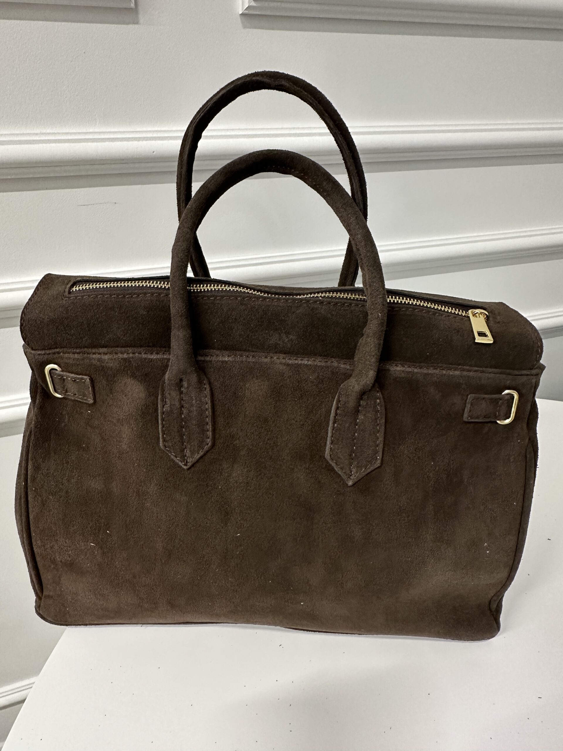 Elegancka modna torba Kuferek- teczka , wykonana ze brązowej skóry zamszowej . Torebka nada każdej stylizacji klasy i szyku . Mieści format A4 podręczny i funkcjonalny. Wnętrze składa się z obszernej komory z kieszonką na telefon lub drobiazgi. Okucia w kolorze złotym. Torebka posiada wygodne rączki do noszenia ,nie posiada dodatkowego długiego paska.