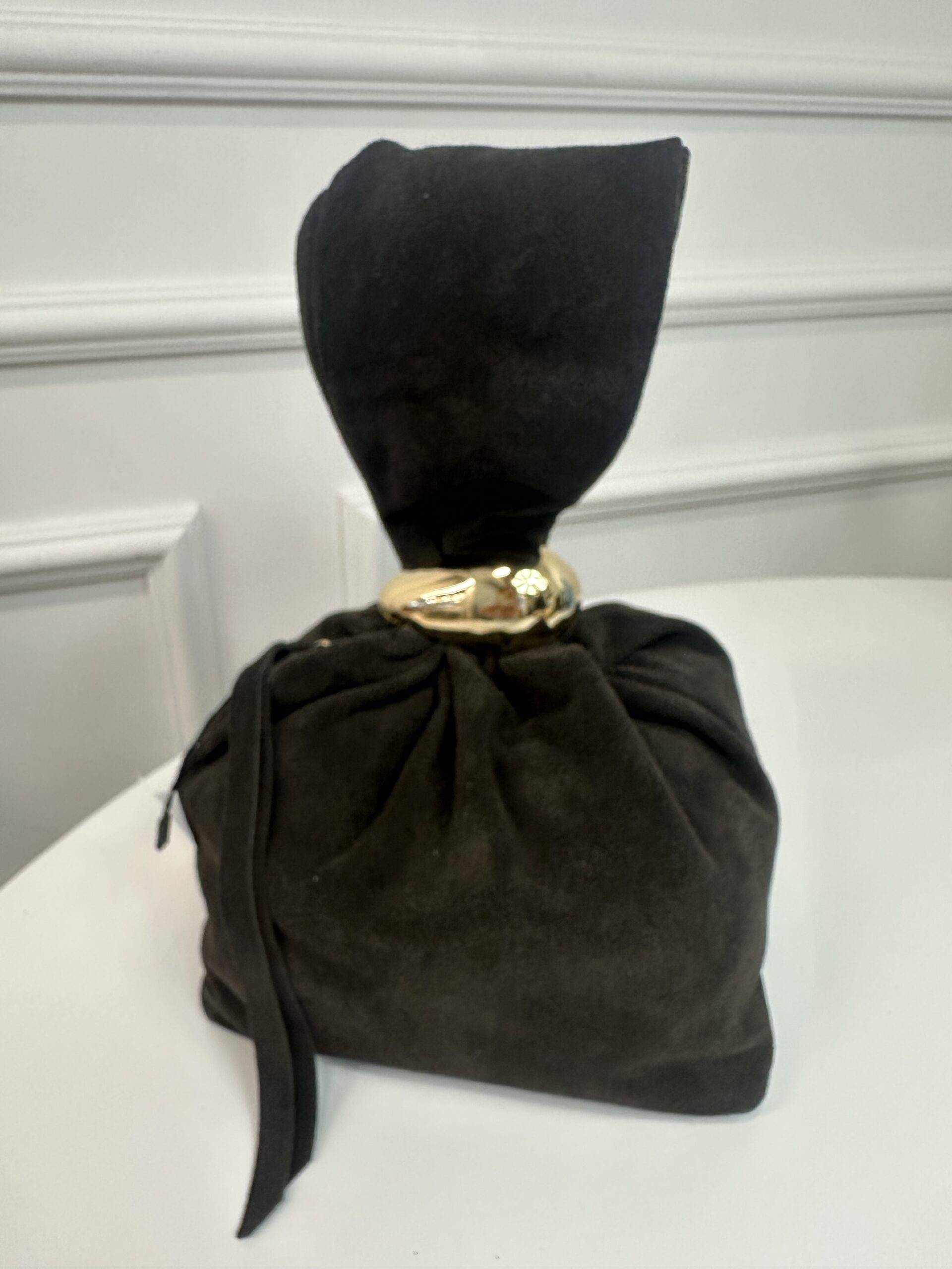 Elegancka mała torebka , wykonana ze skóry zamszowej w kolorze czekoladowym z dekoracyjnym metalowym elementem . Torebka nada kazdej stylizacji szyku.