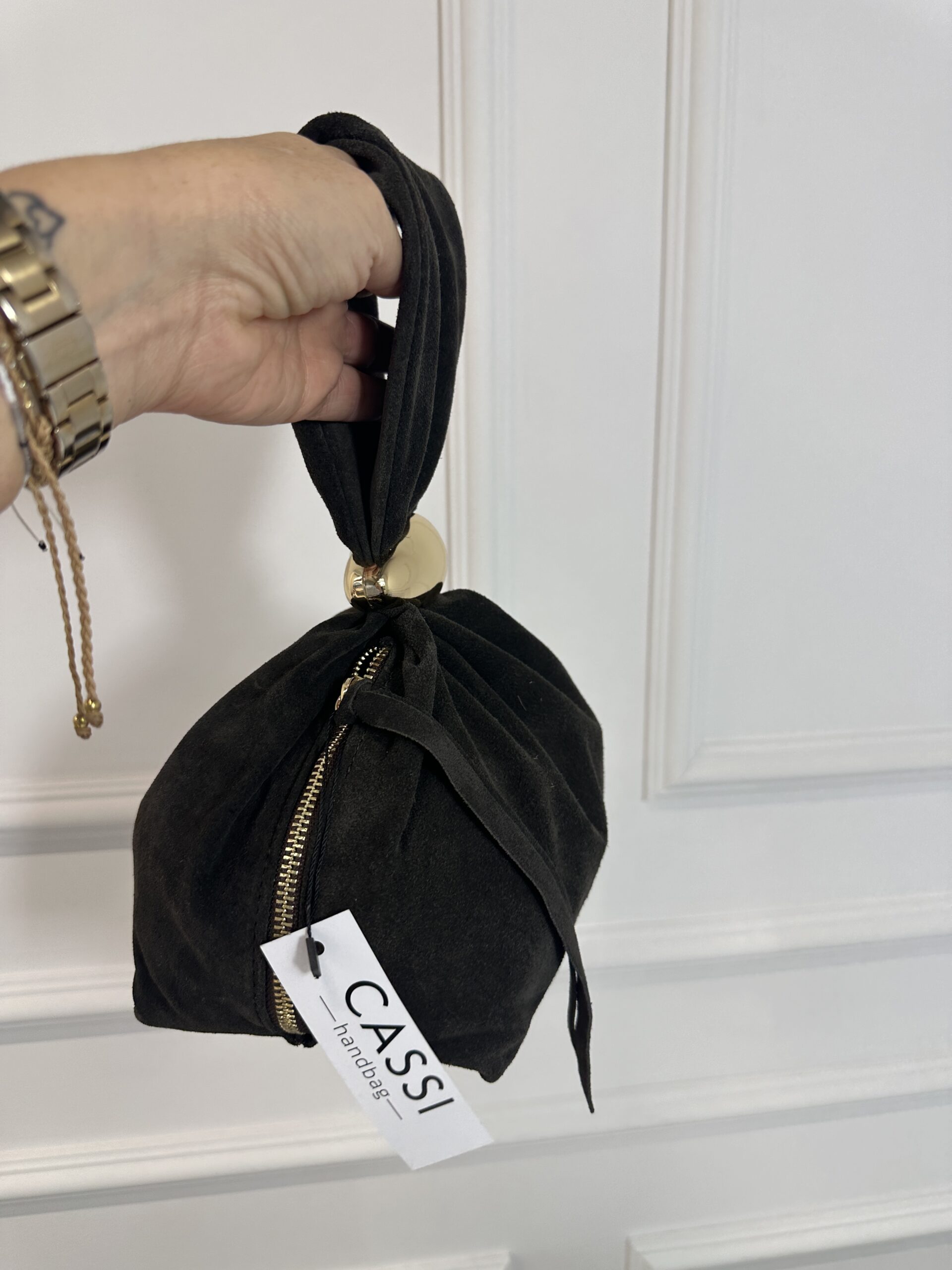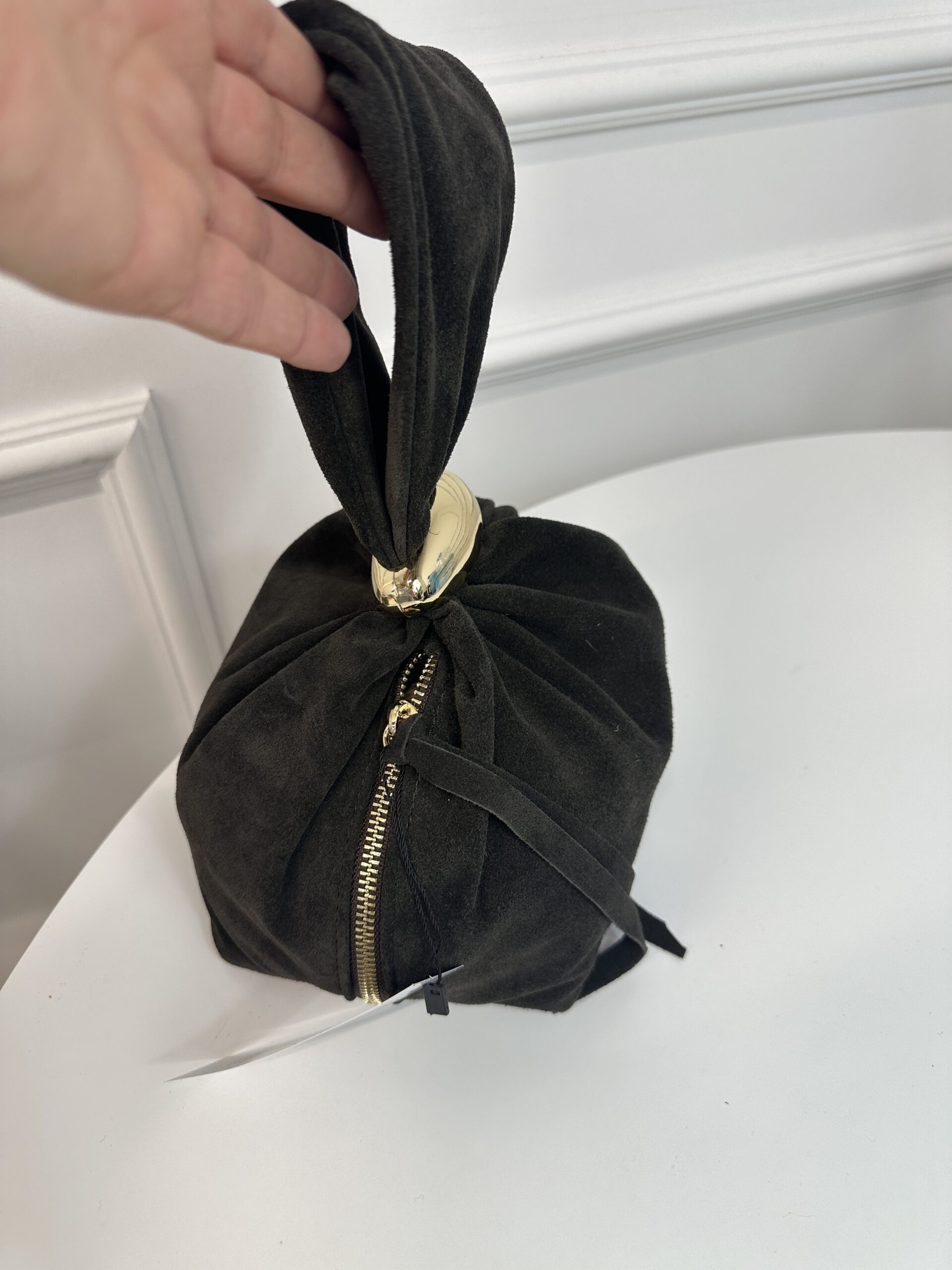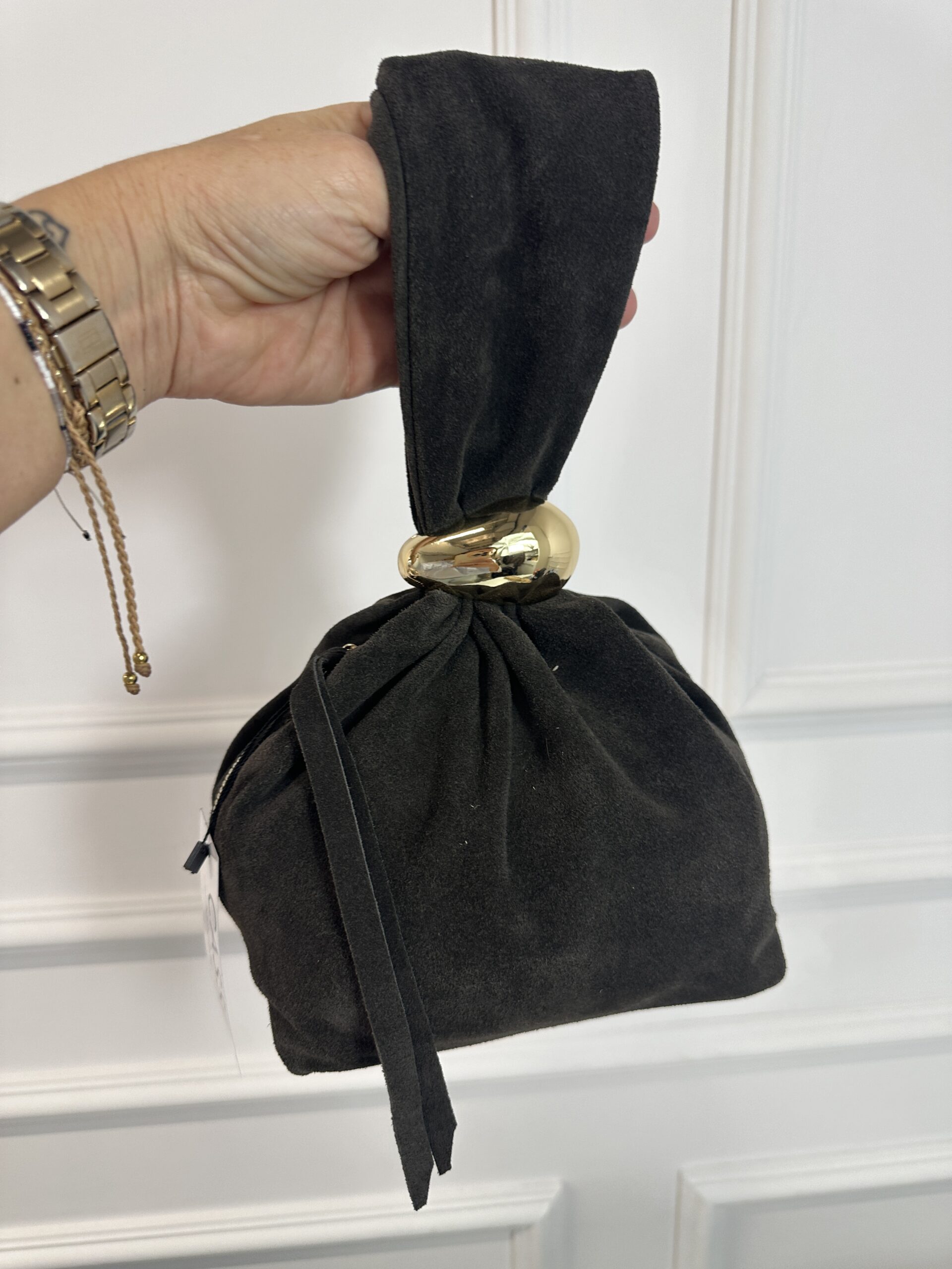 Brązowa zamszowa torebka do ręki z metalowym elementem