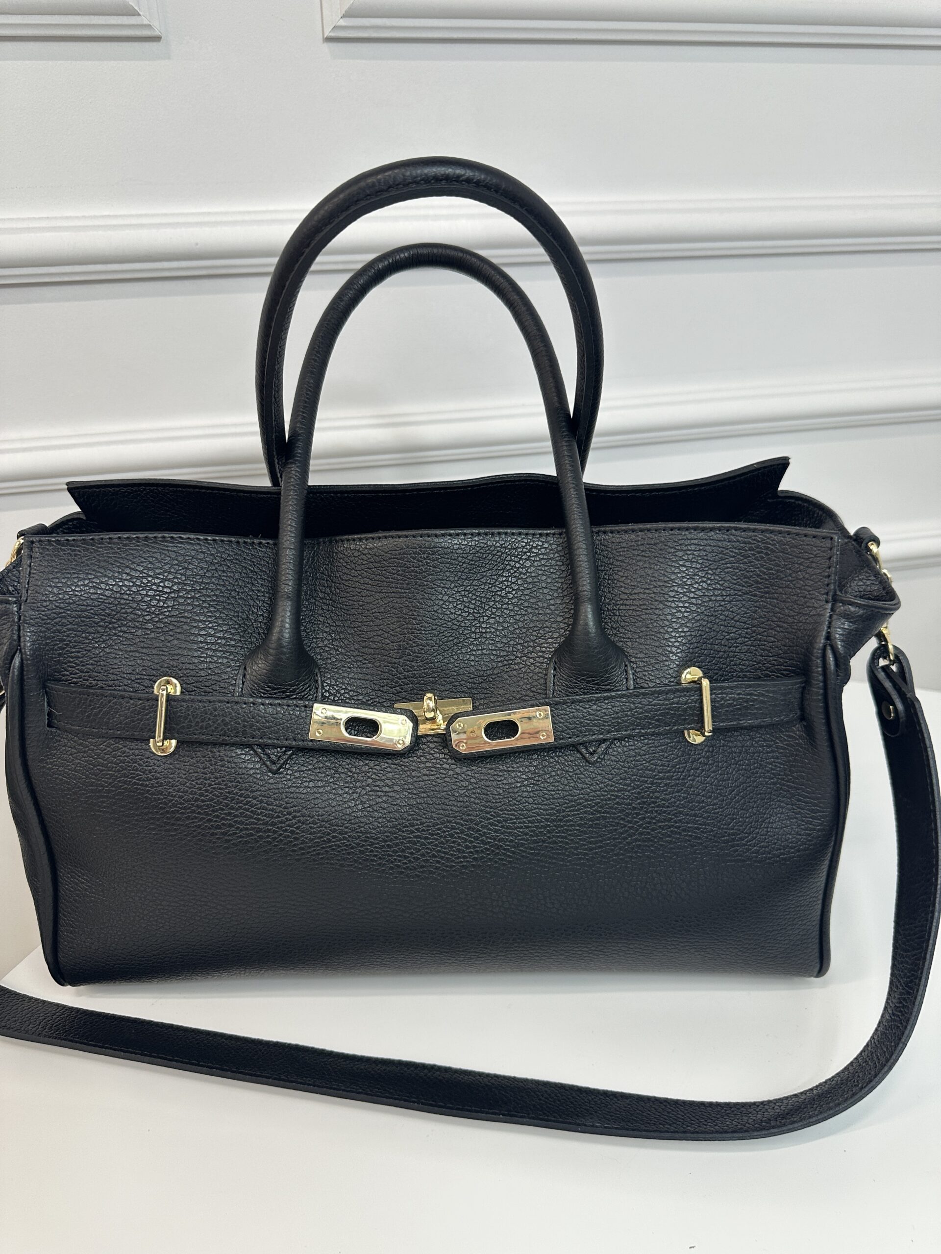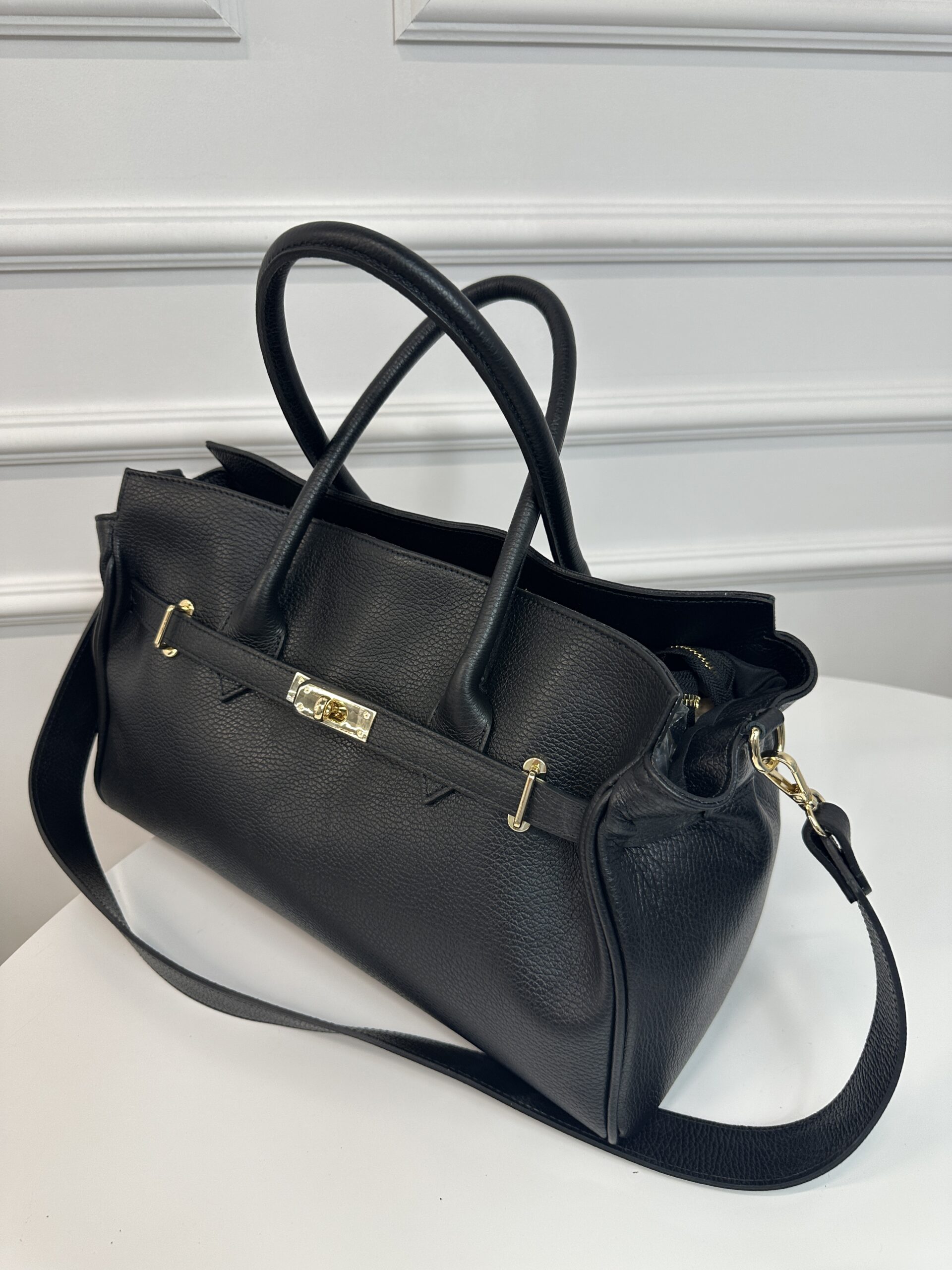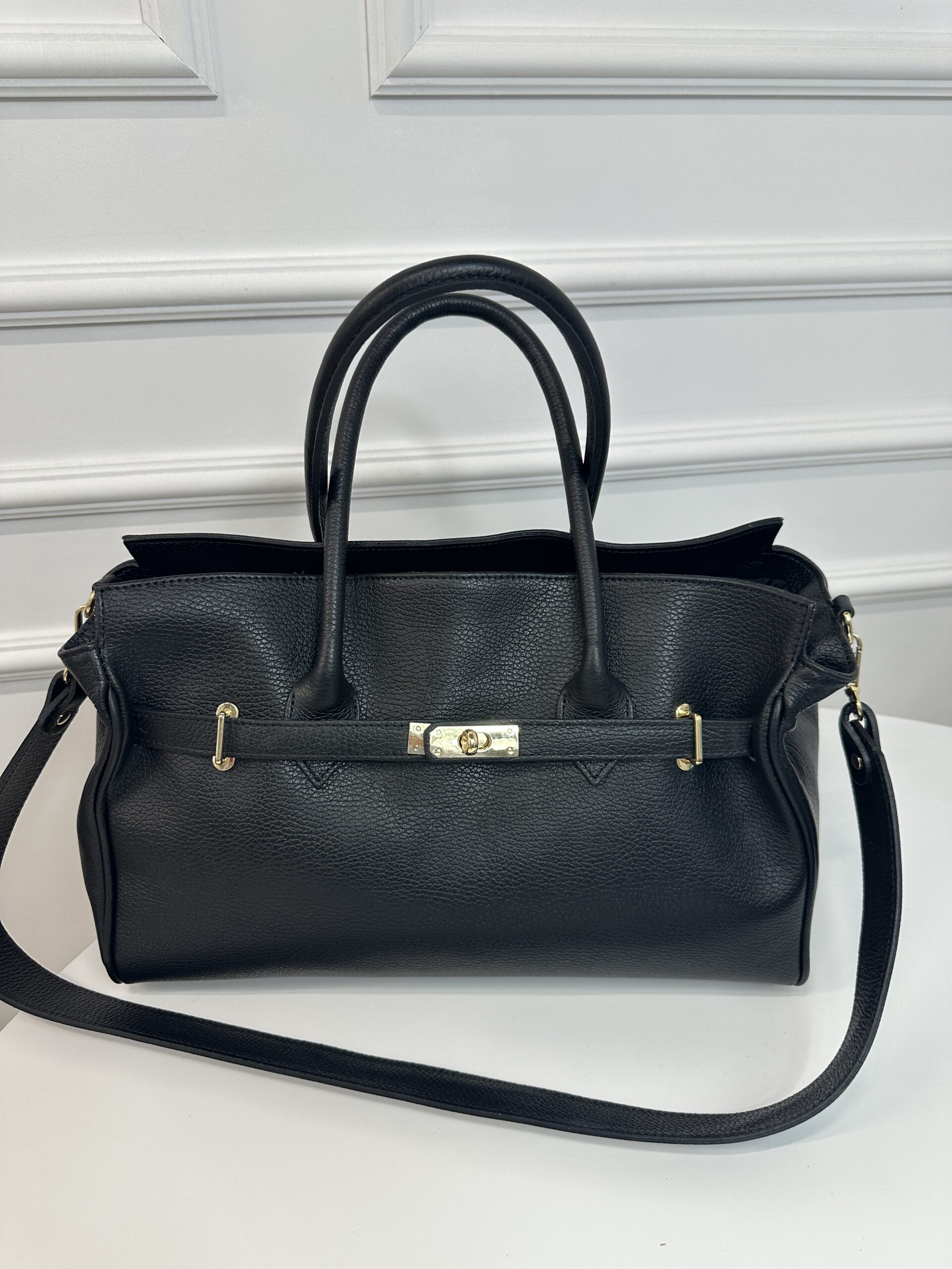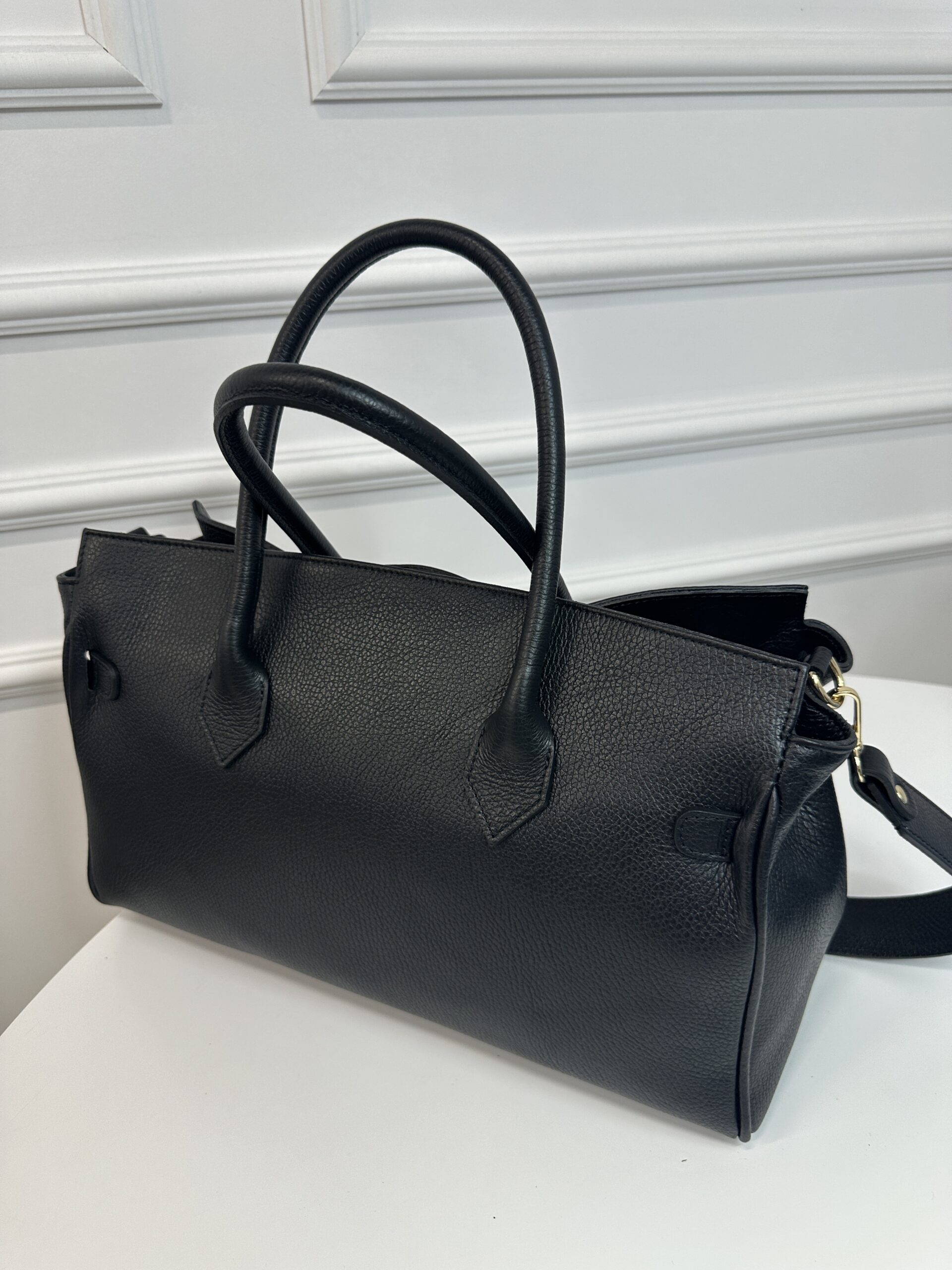 Torebka jednokomorowa wykonana ze skóry naturalnej . Wewnątrz jedna komora oraz 2 kieszonki , 1 zamykana na zamek. Torebka jest wyjątkowa pojemna, pomieści wszystkie niezbędne rzeczy.To idealny dodatek do codziennych stylizacji .Torebka posiada dwie skórzane rączki do noszenia torby w ręku i szeroki dopinany pasek. Okucia w kolorze złotym.