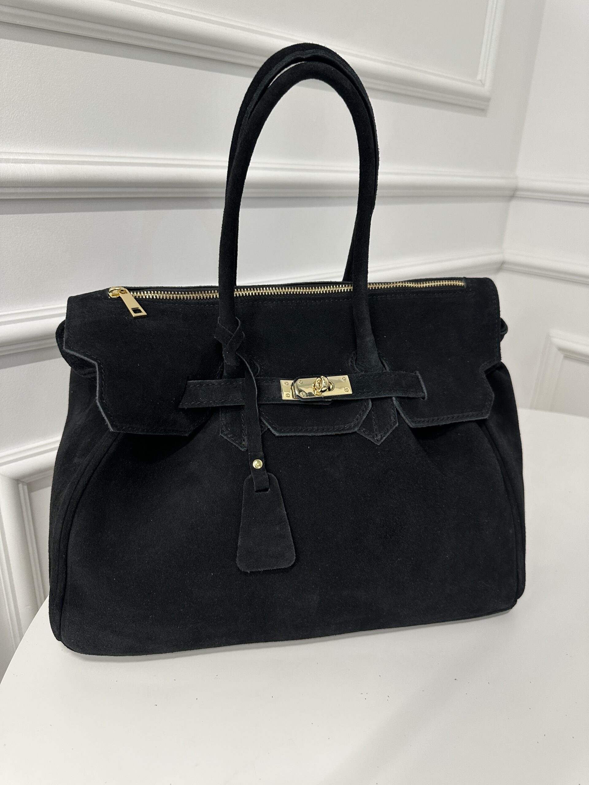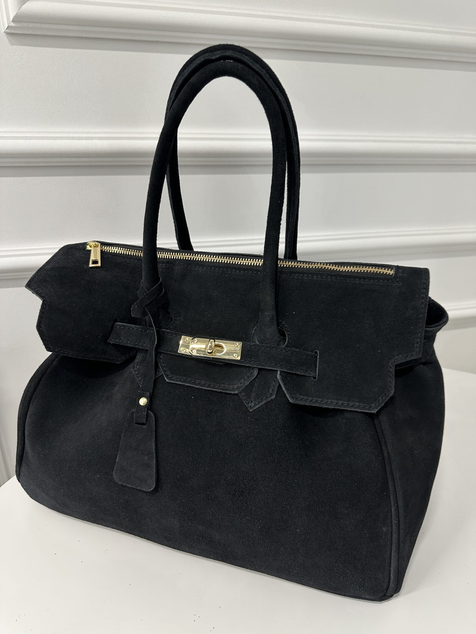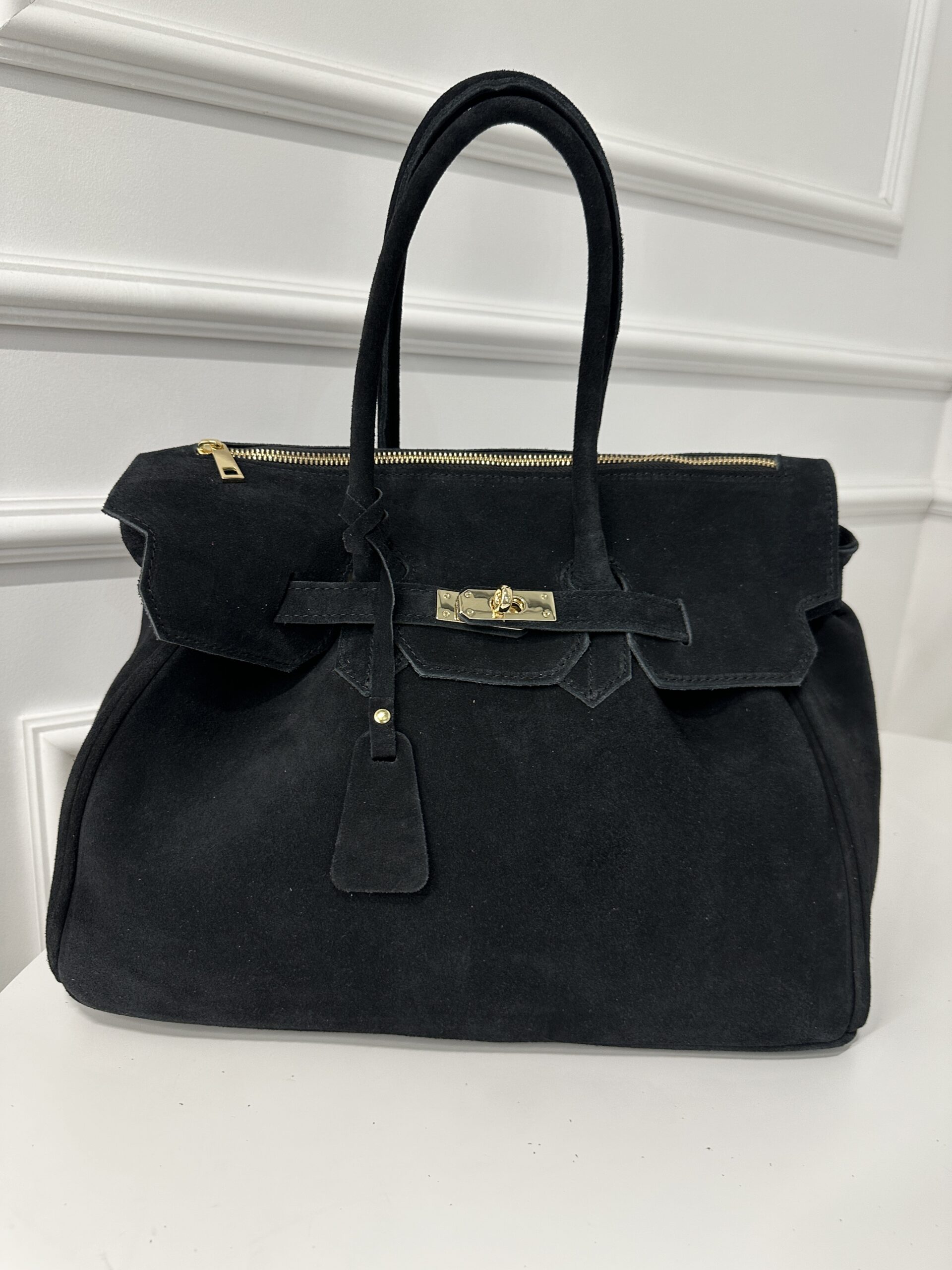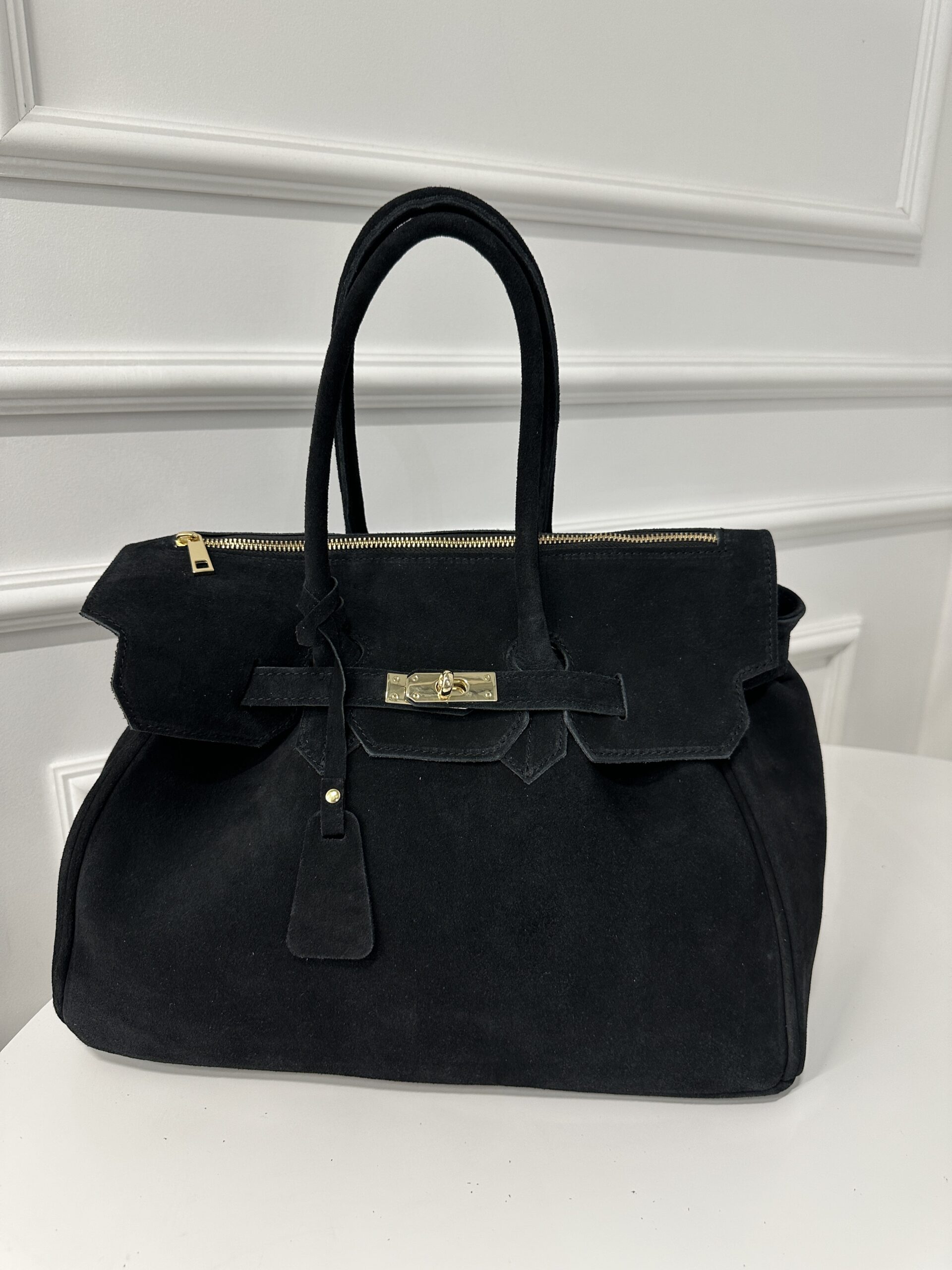 Elegancka modna torba Kuferek- teczka , wykonana ze czarnej skóry zamszowej . Torebka nada każdej stylizacji klasy i szyku . Mieści format A4 podręczny i funkcjonalny. Wnętrze składa się z obszernej komory z kieszonką na telefon lub drobiazgi. Okucia w kolorze złotym. Torebka posiada wygodne rączki do noszenia ,nie posiada dodatkowego długiego paska.