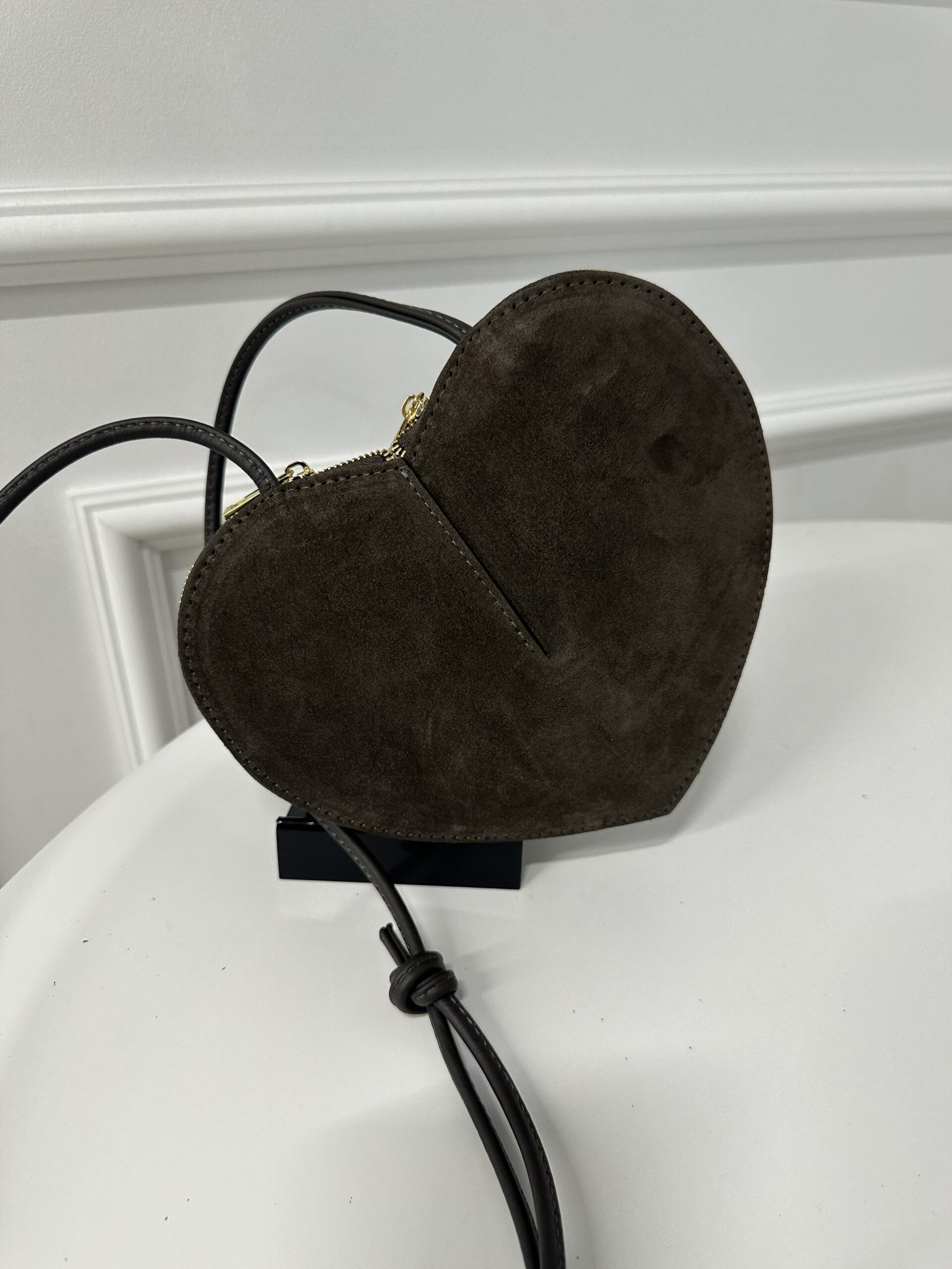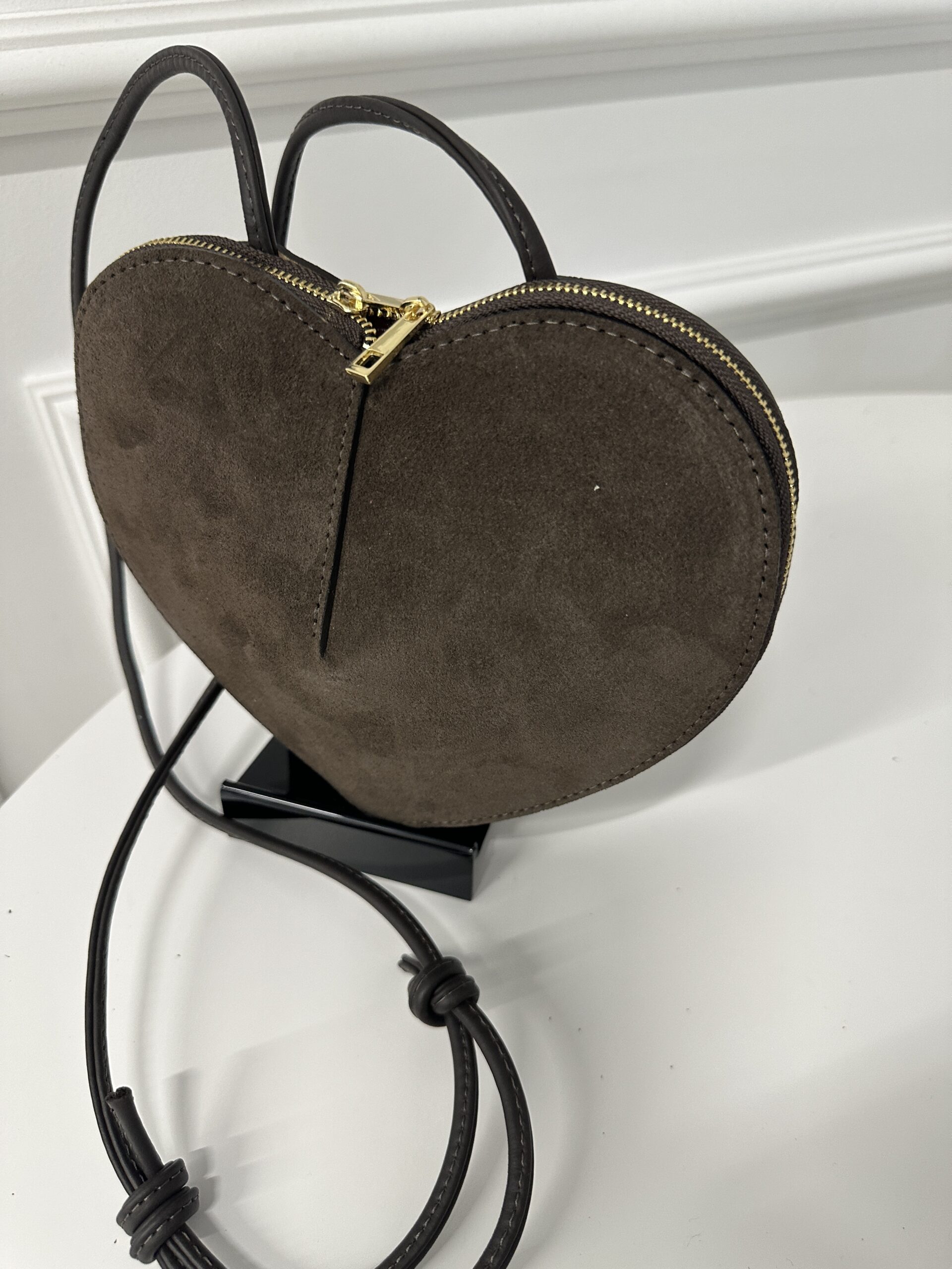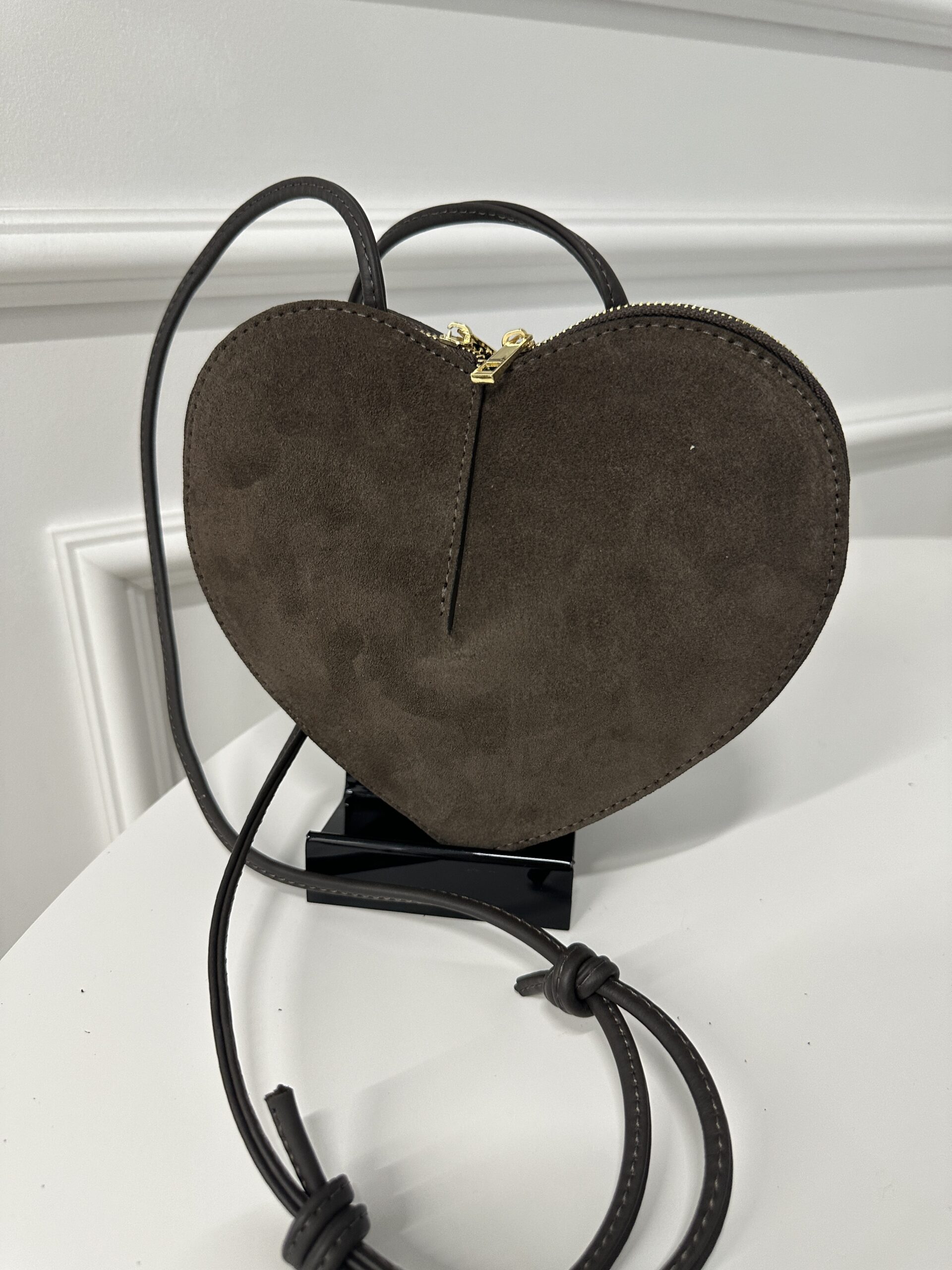 Torebka niezwykle modna w tym sezonie w ponadczasowej formie serduszko wykonana z wysoko jakości skóry zamszowej w kolorze czekolady . Bardzo modna w tym sezonie . Wewnątrz jedna komora Torebeczka posiada cieniutki skórzany pasek regulowany. Idealna do każdej eleganckiej stylizacji.