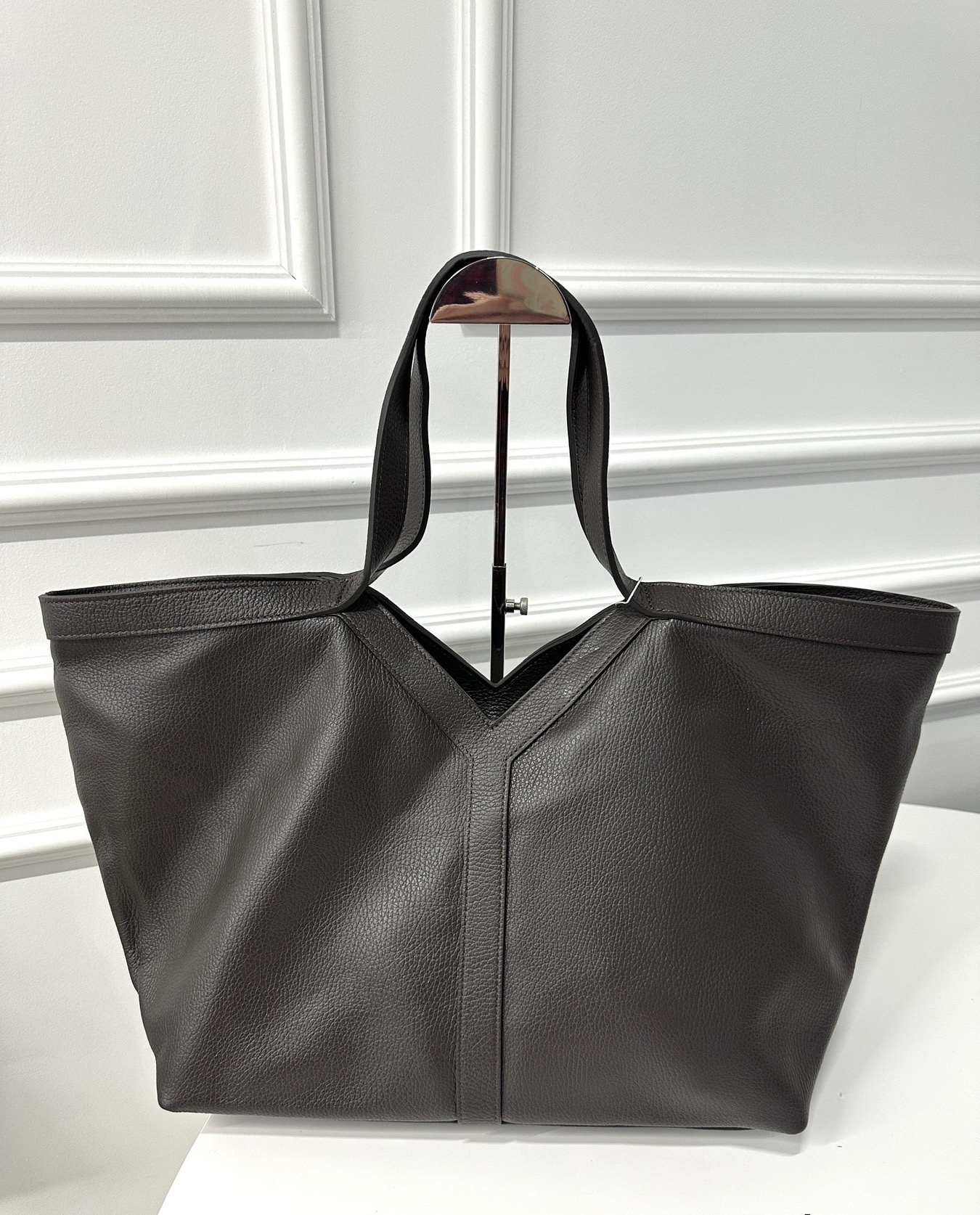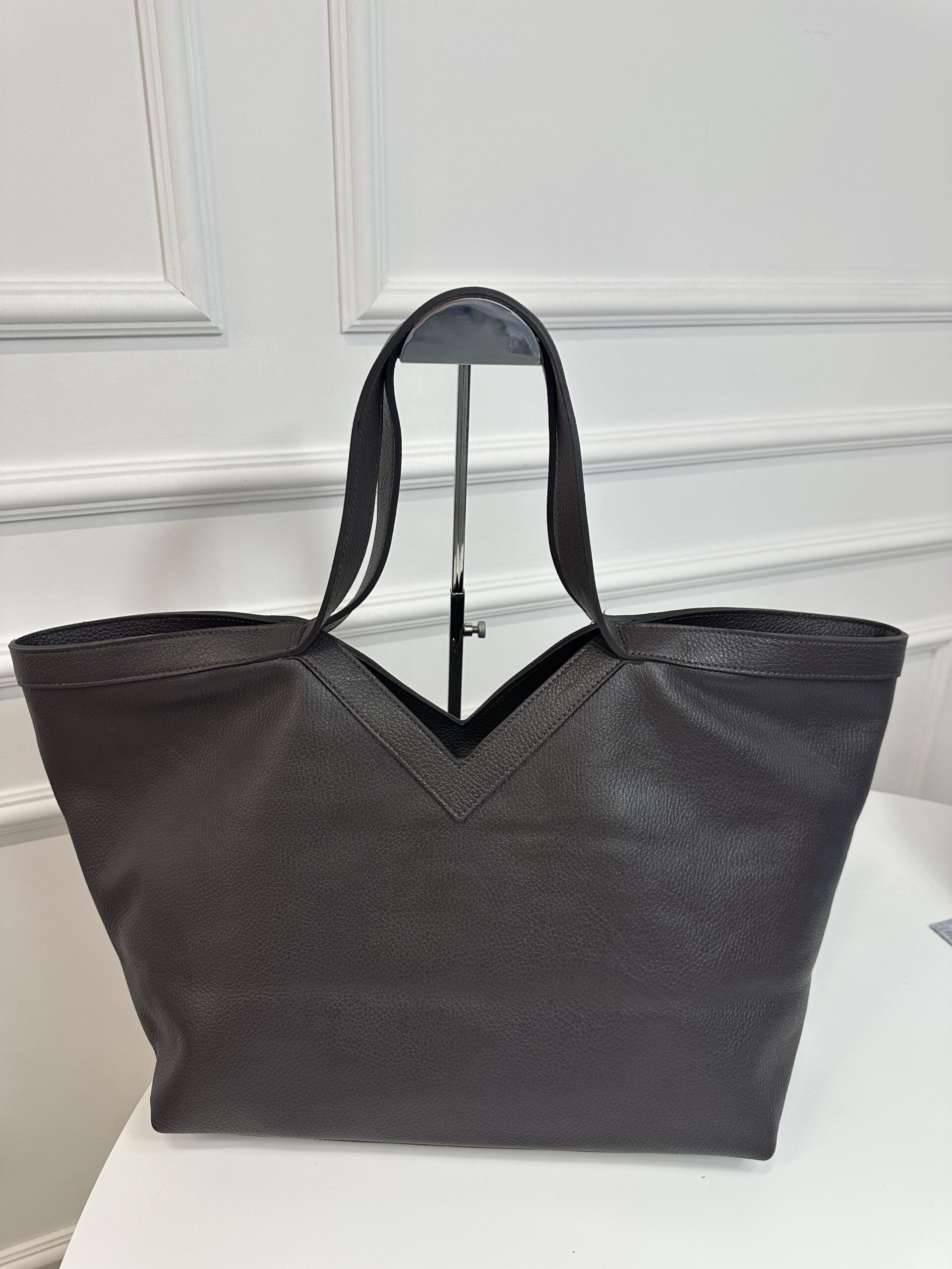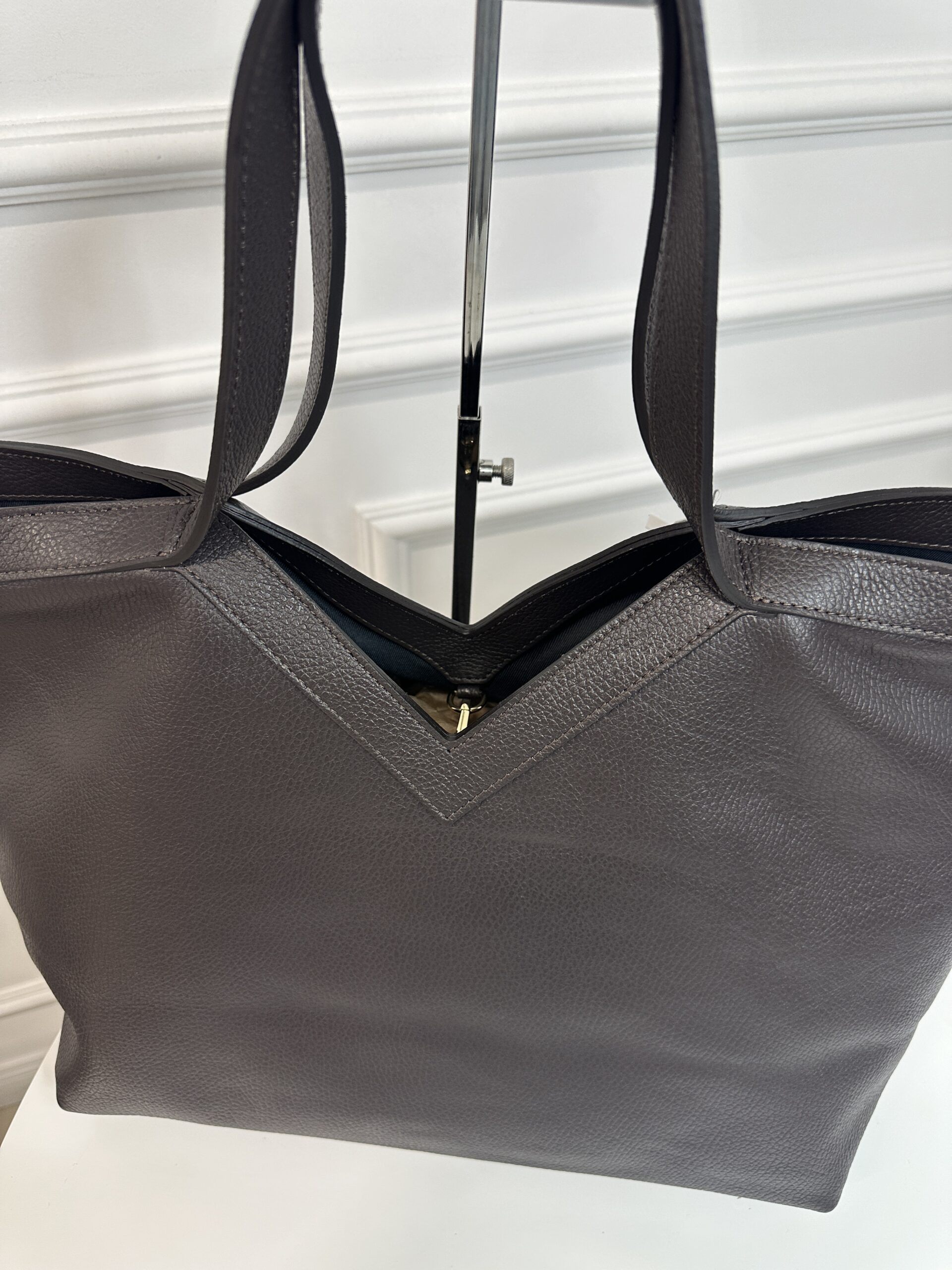 Elegancka torebka shopper z wycięciem w kształcie literki V , wykonana ze skóry groszkowej w kolorze czekoladowym . Torebka nada każdej stylizacji klasy i szyku . Mieści format A4 podręczny i funkcjonalny. Wnętrze składa się z obszernej komory z kieszonką na telefon lub drobiazgi. Okucia w kolorze złotym. Torebka posiada wygodne rączki skórzane .Brak wewnetrznego zamka zapięcie na haczyk.