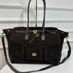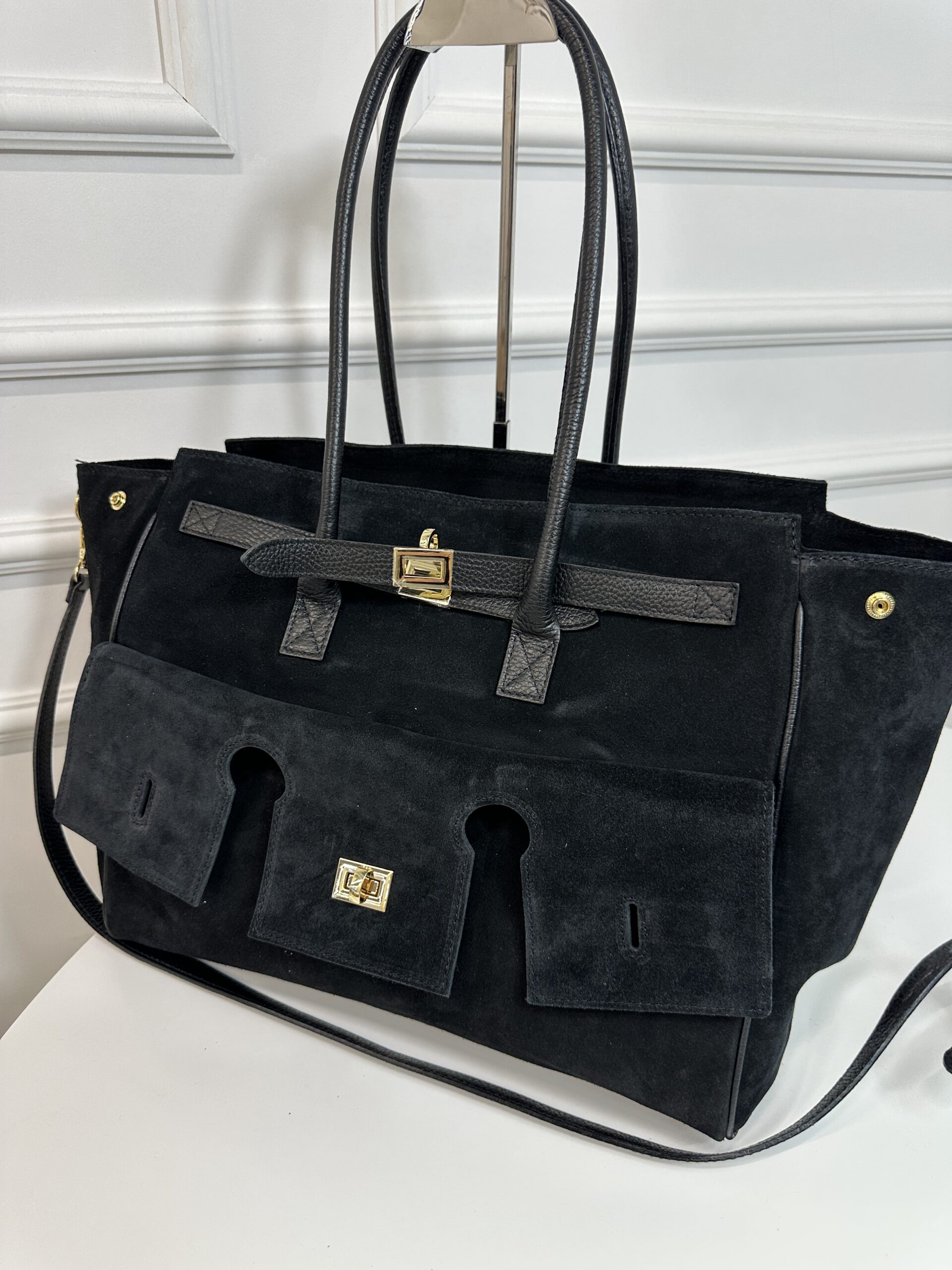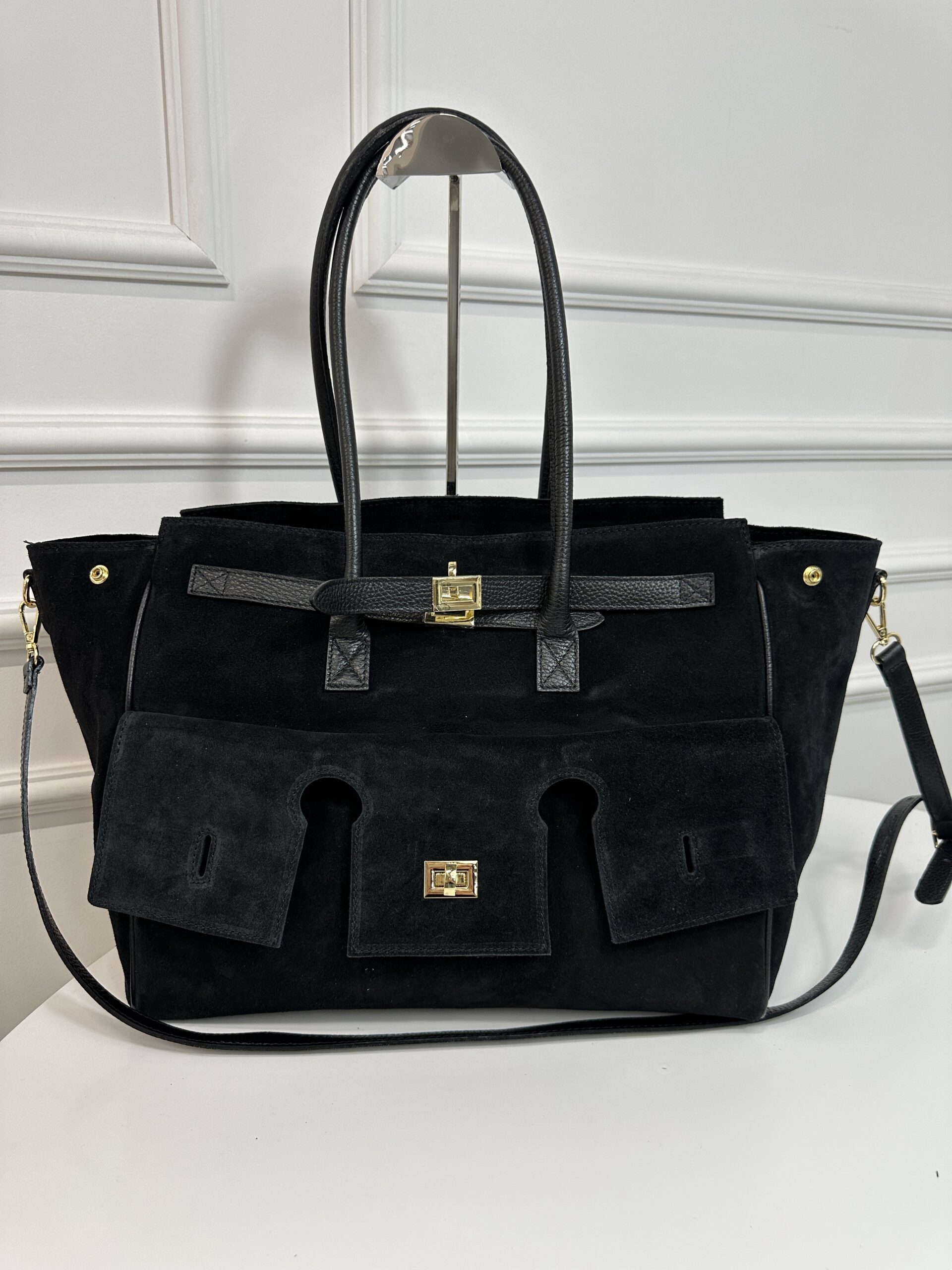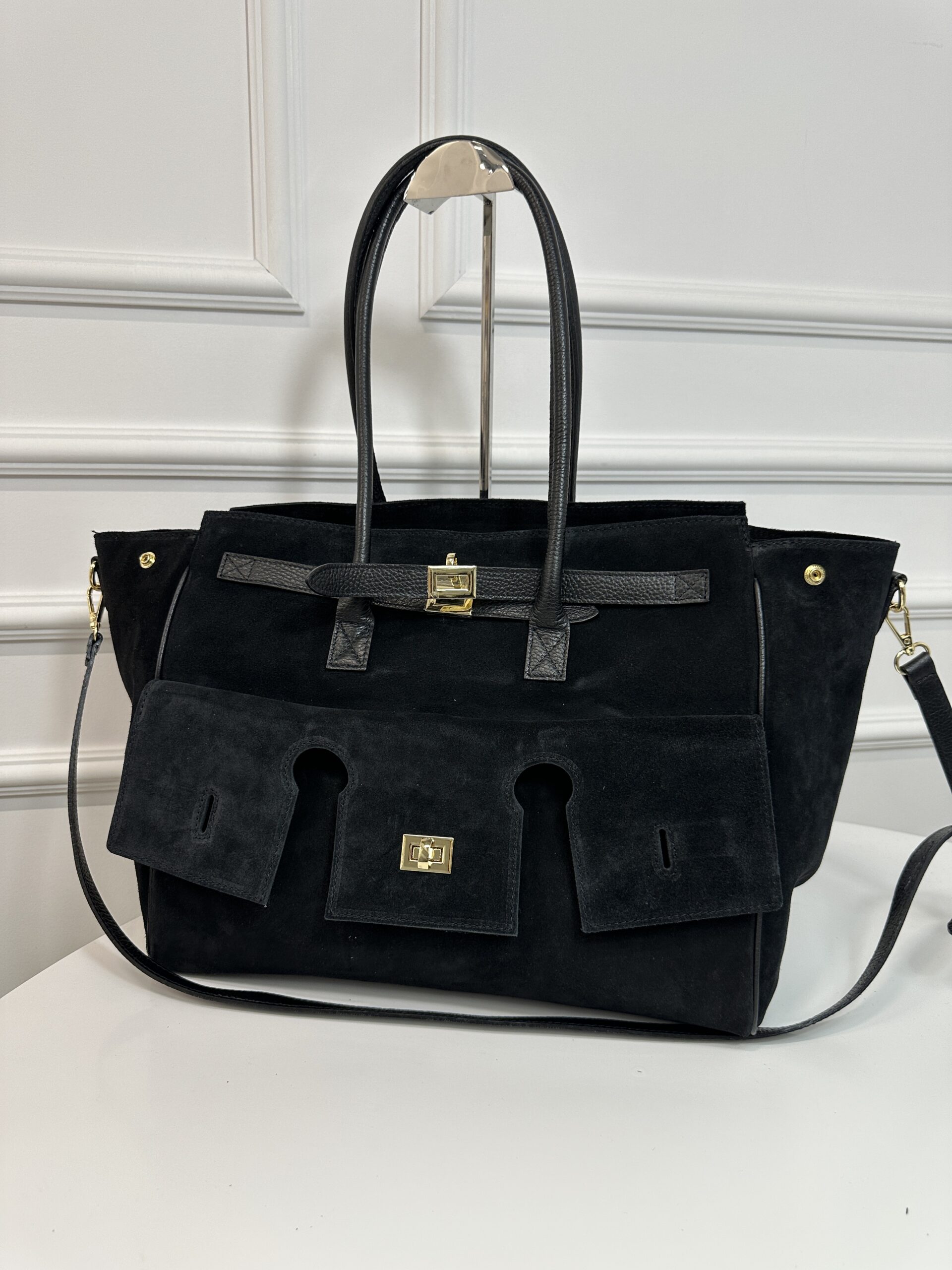 Elegancka stylowa torba wykonana ze skóry zamszowej w większym rozmiarze .Torebka nada każdej stylizacji klasy i szyku . Model niezwykle podręczny i funkcjonalny. Z przodu znajduje się ciekawa kieszeń która doda funkcjonalności wyjątkowego wyglądu, Wnętrze składa się z obszernej komory z kieszonką na telefon lub drobiazgi. Torebka jest bardzo pojemna pomieści bez problemu dokumenty A4, tablet Okucia w kolorze złotym. Torebka posiada wygodne rączki skórzane i pasek.
