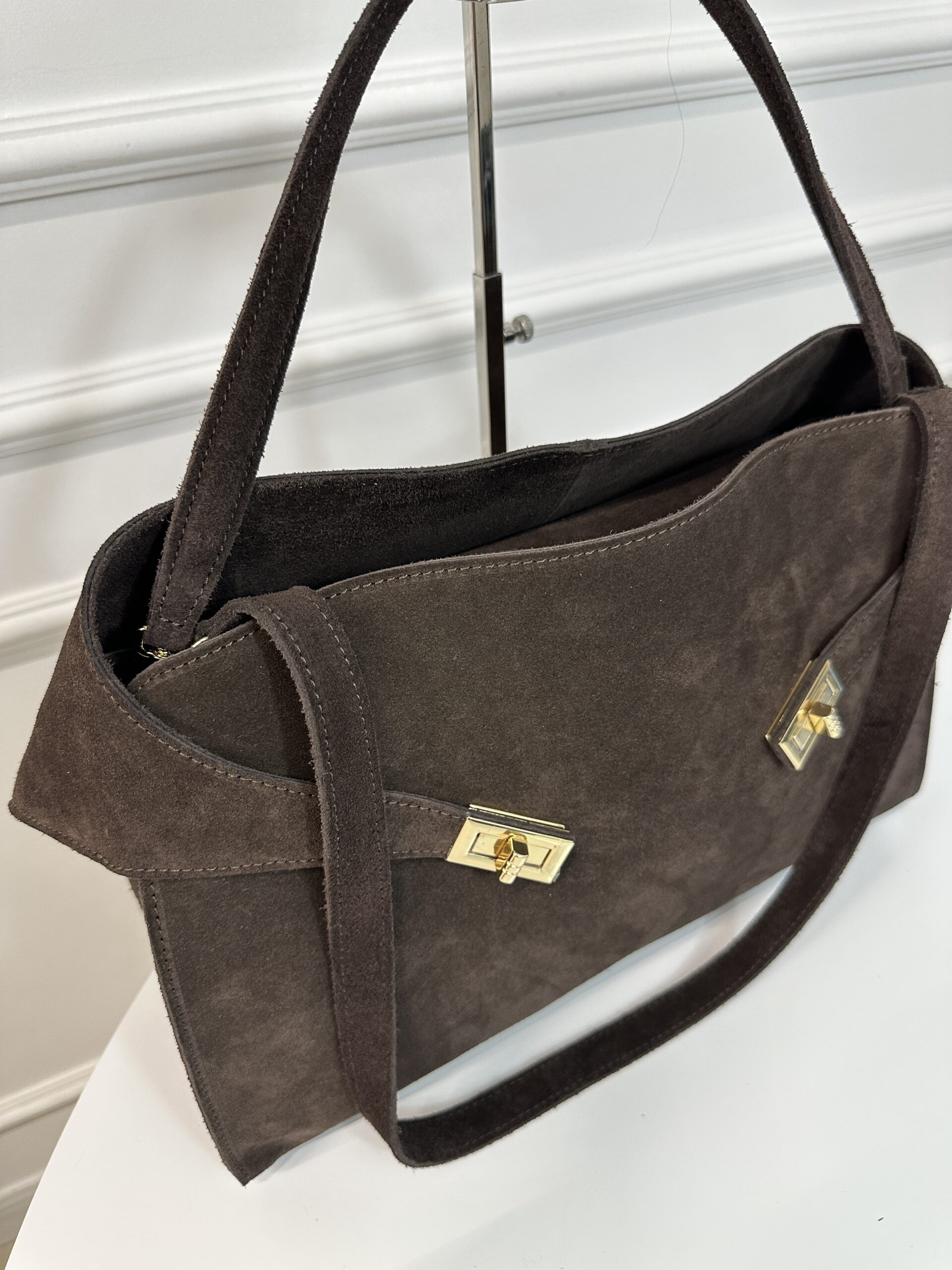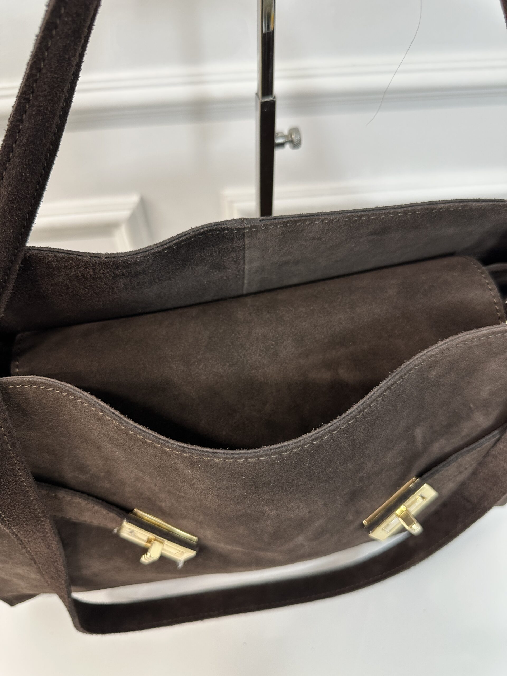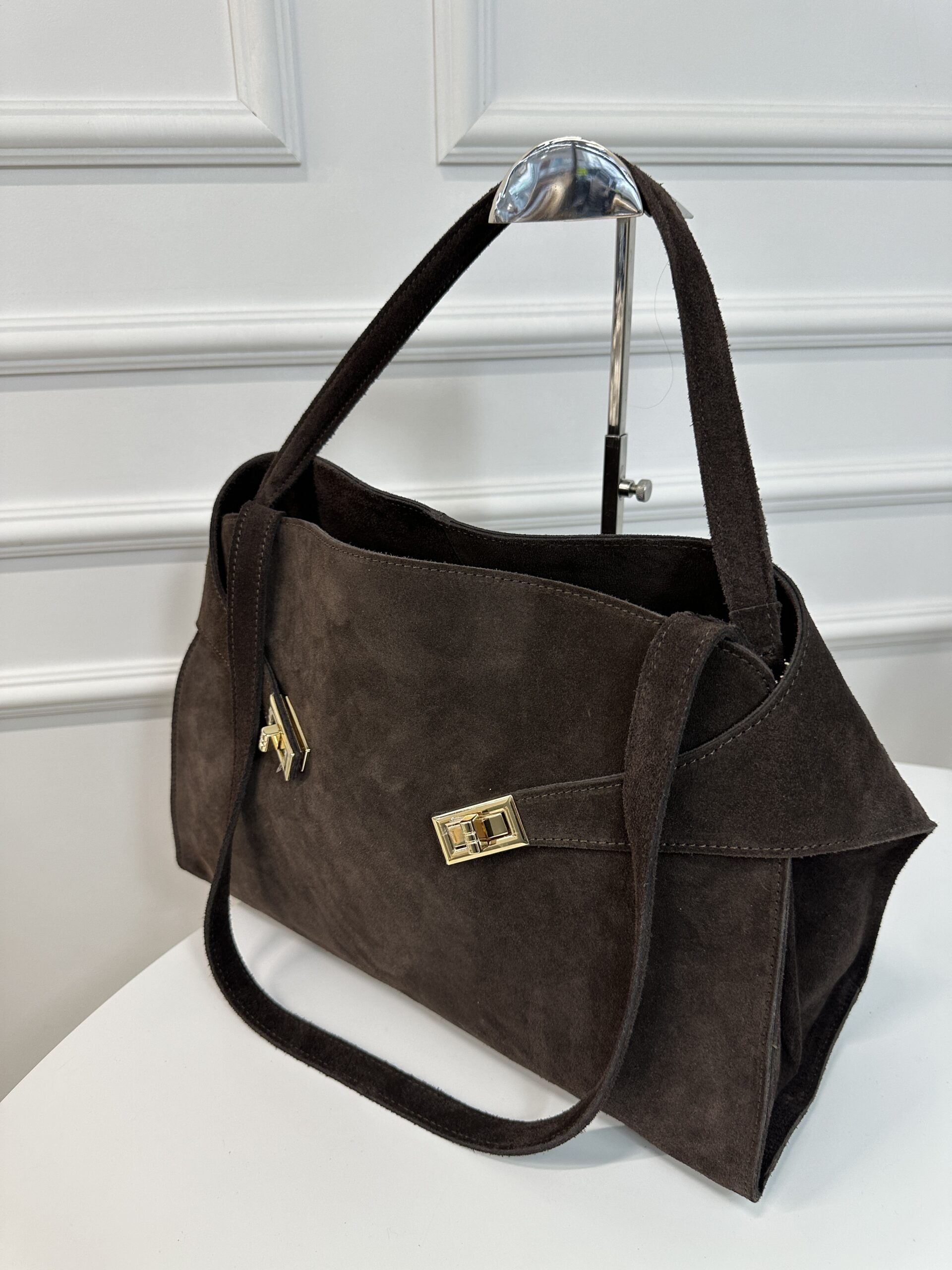 Elegancka stylowa torba wykonana ze skóry zamszowej w większym rozmiarze .Torebka nada każdej stylizacji klasy i szyku . Model niezwykle podręczny i funkcjonalny. Z przodu znajduje się ciekawe dekoracyjne klamry które dodaja wyjątkowego wyglądu, Wnętrze składa się z obszernej komory z kieszonką na telefon lub drobiazgi. Torebka jest bardzo pojemna pomieści bez problemu dokumenty A4, tablet . Okucia w kolorze złotym. Torebka posiada wygodną rączkę skórzaną i pasek.