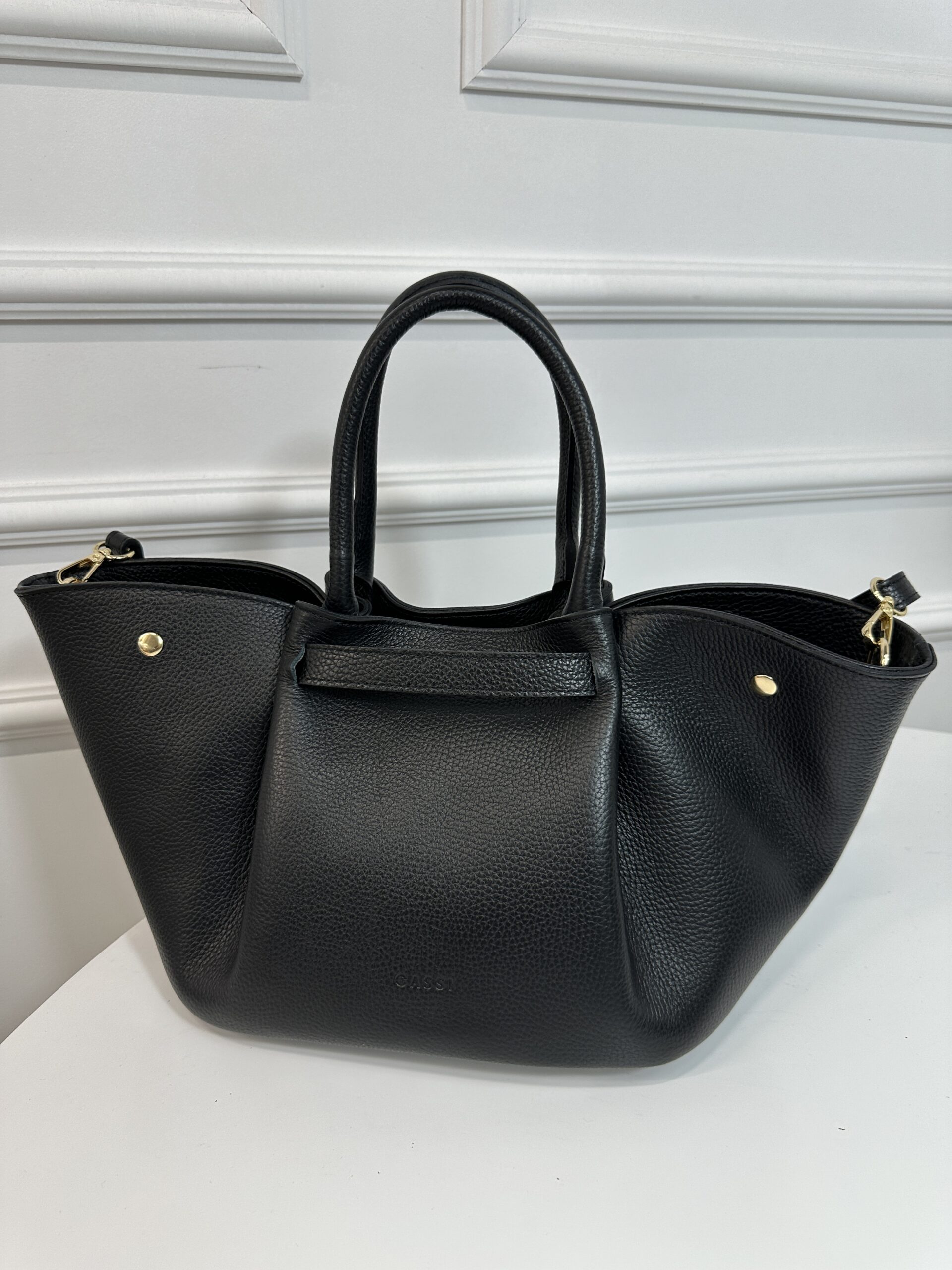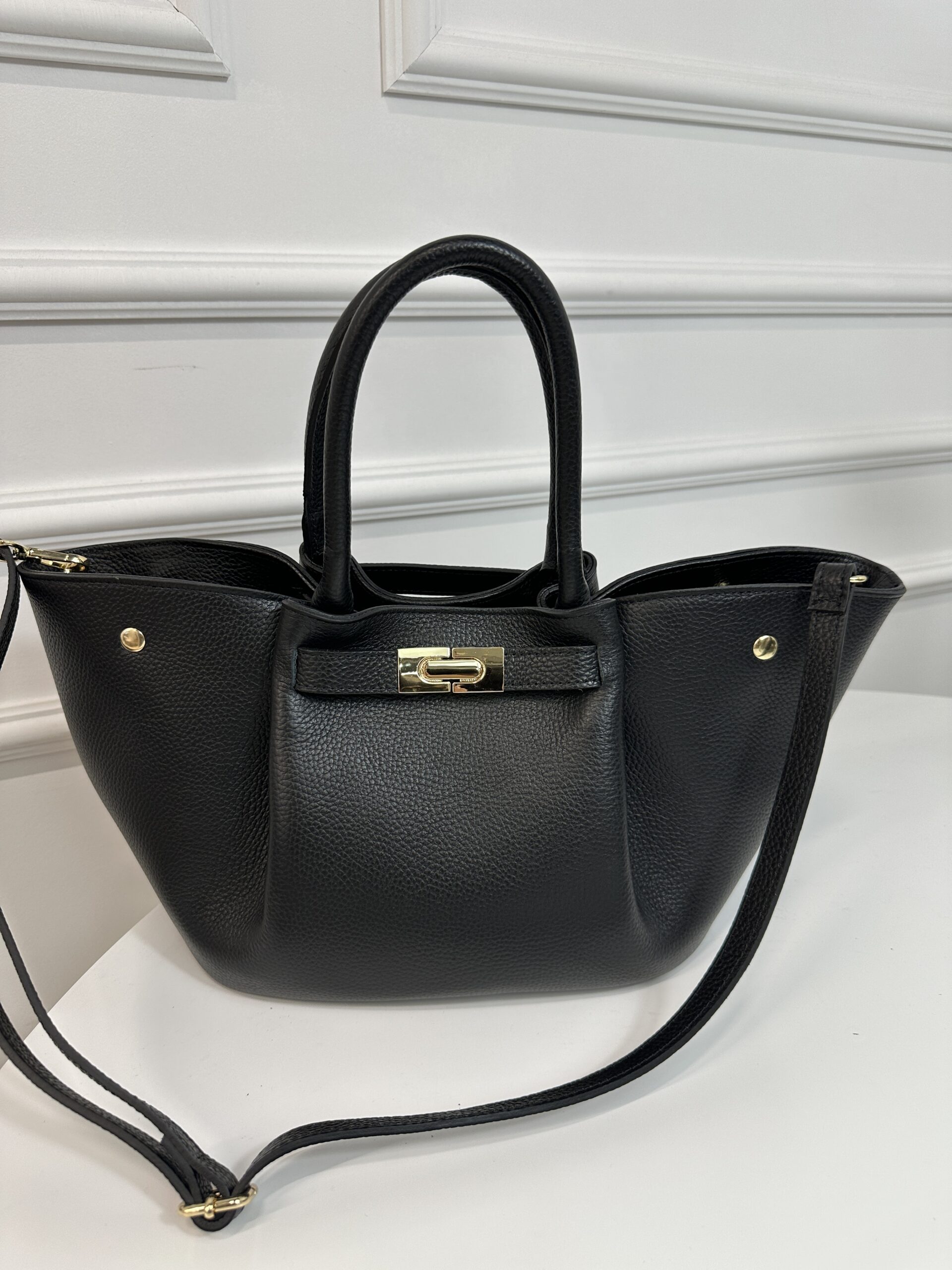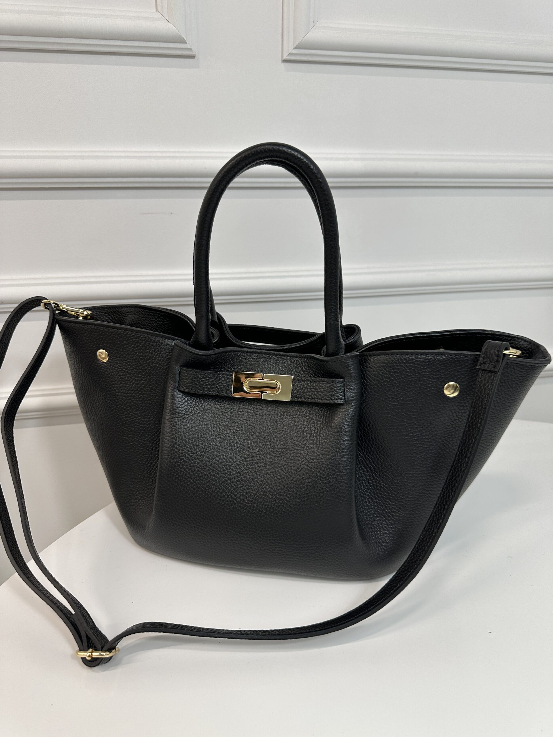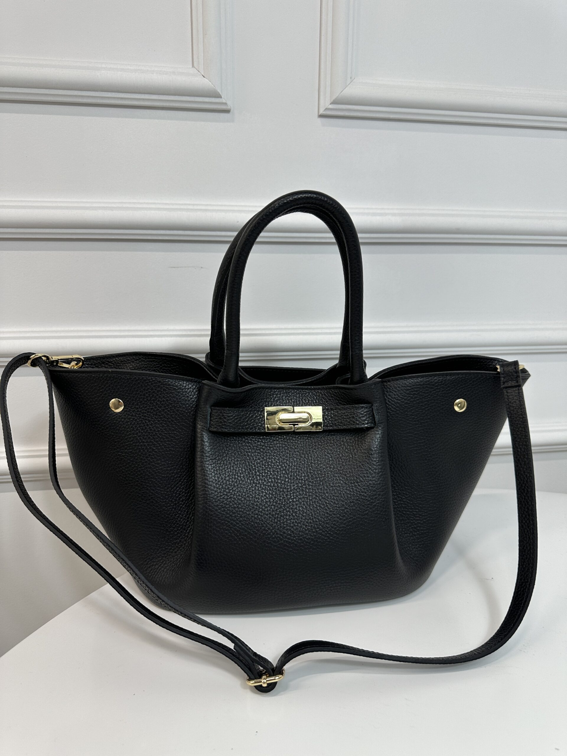 Świetnie wykonana z dbałością o każdy szczegół skórzana torebka w kolorze czarnym . Wygląda niezwykle oryginalnie i stylowo- połączenie elegancji i nowoczesności ,Wewnątrz torebki jedna komora z dodatkową kieszonką na drobiazgi. Torebka posiada wygodne uszy i dodatkowo skórzany pasek. Torebkę można nosić w ręku i na ramieniu. Okucia w kolorze złotym . Torebka zapinana na suwak,