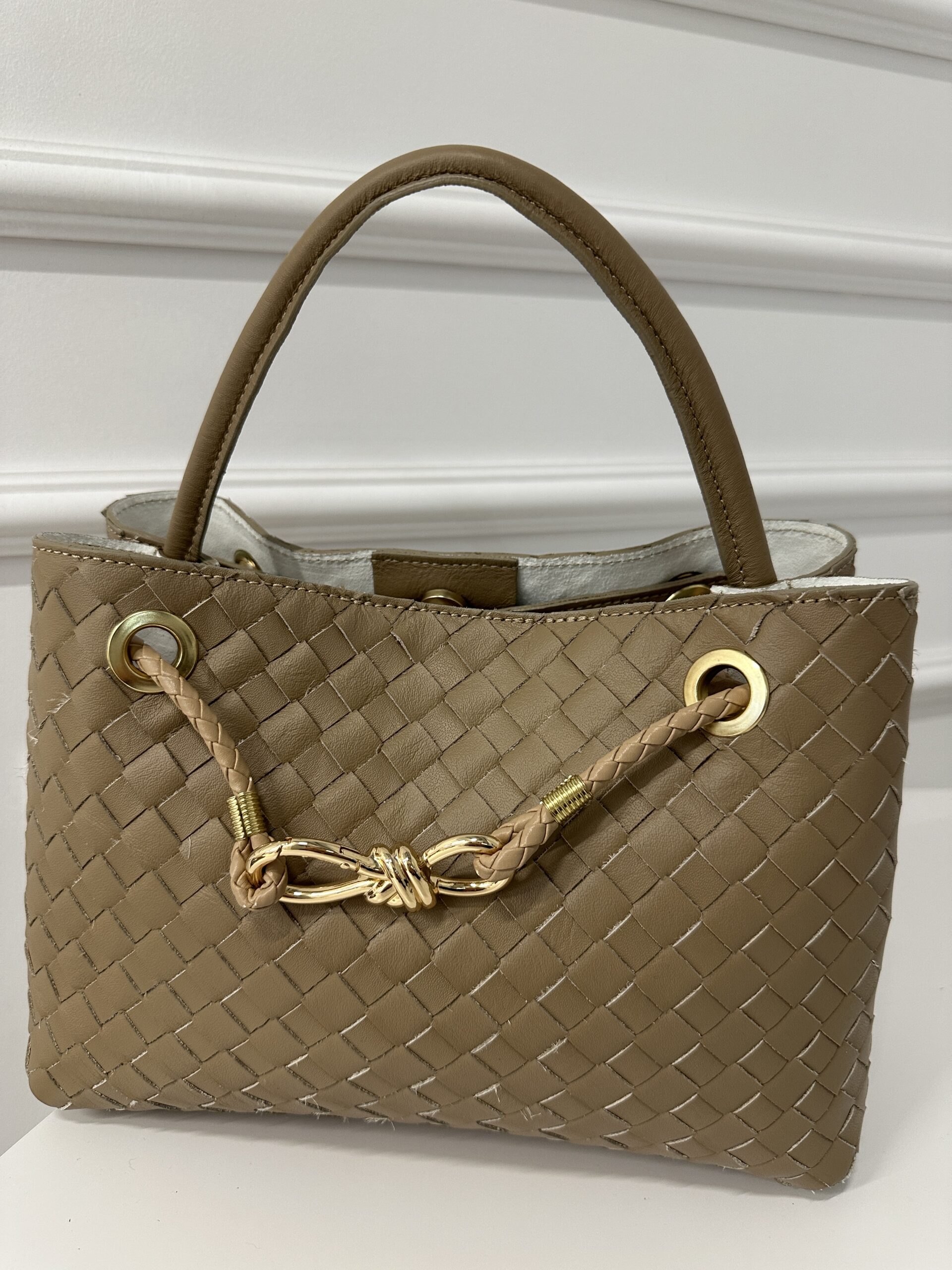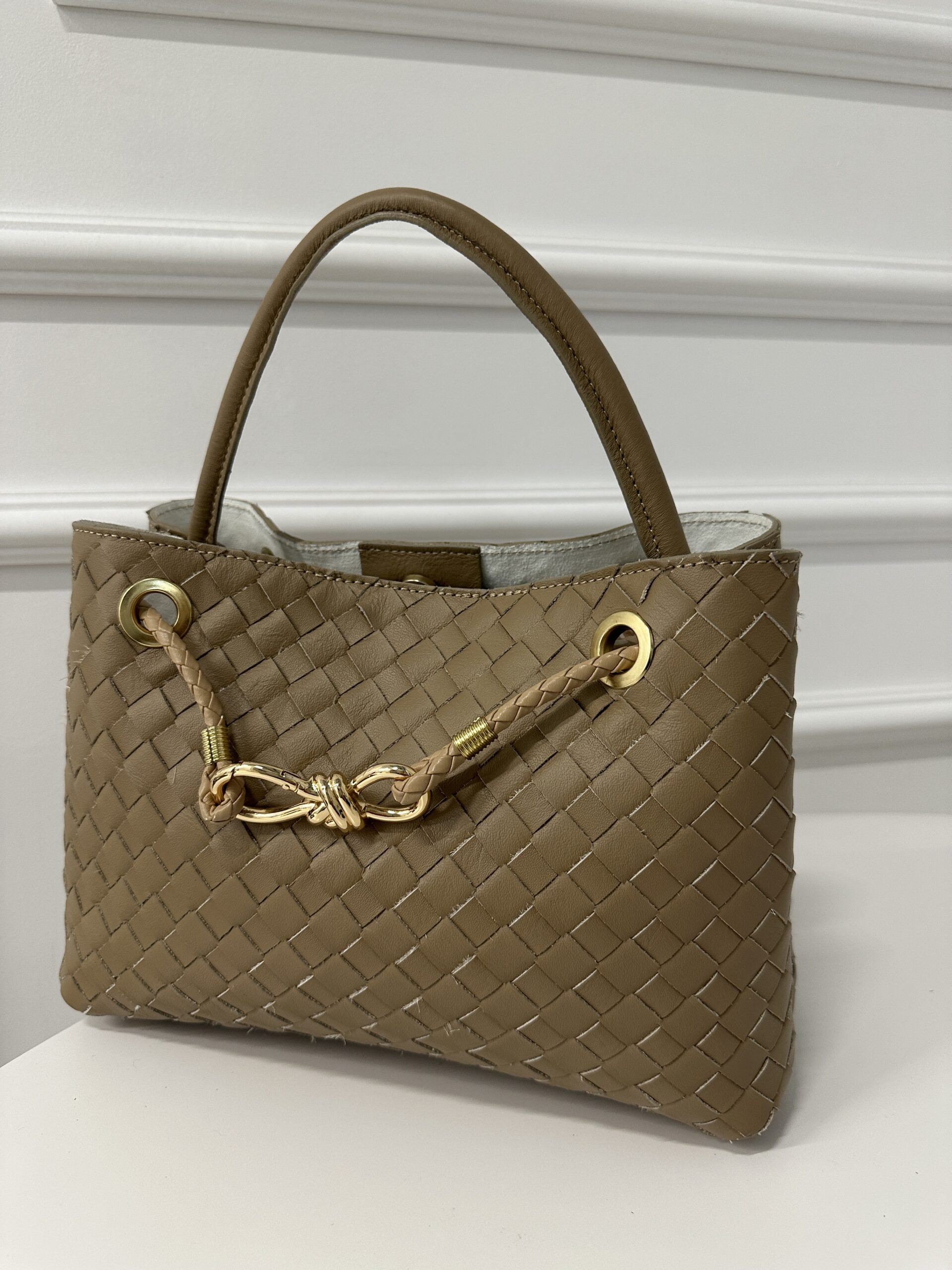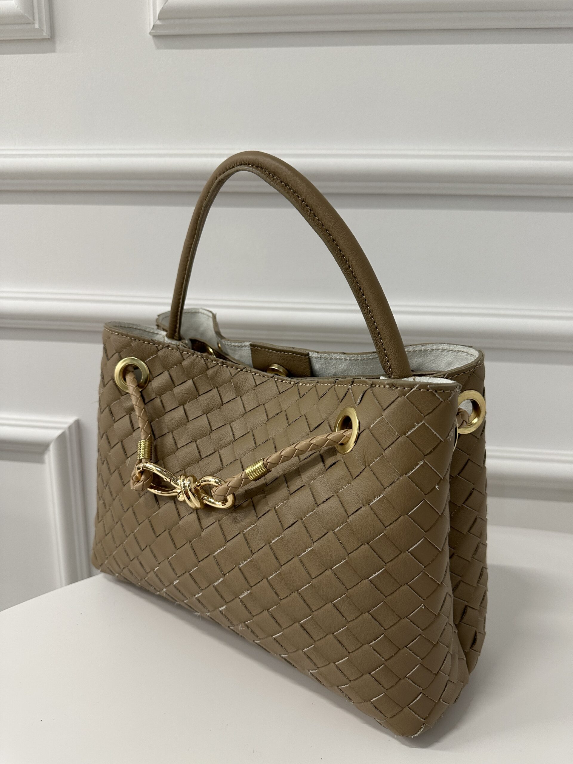 Torebka kuferek wykonany ze miękkiej gładkiej ,skóry przeplatanej w kolorze ciemnego beżu. Wewnątrz torebki jest jedna komora zamykana na nap, kieszonka na telefon, okucia w kolorze złotym. Torebka posiada wygodne ucho skórzane i skórzany przeplatany pasek . Torebka idealna do biznesowych stylizacji .Torebkę można nosić w ręku jak i na ramieniu. Na przodzie dekoracyjna ozdoba w kolorze złotym.