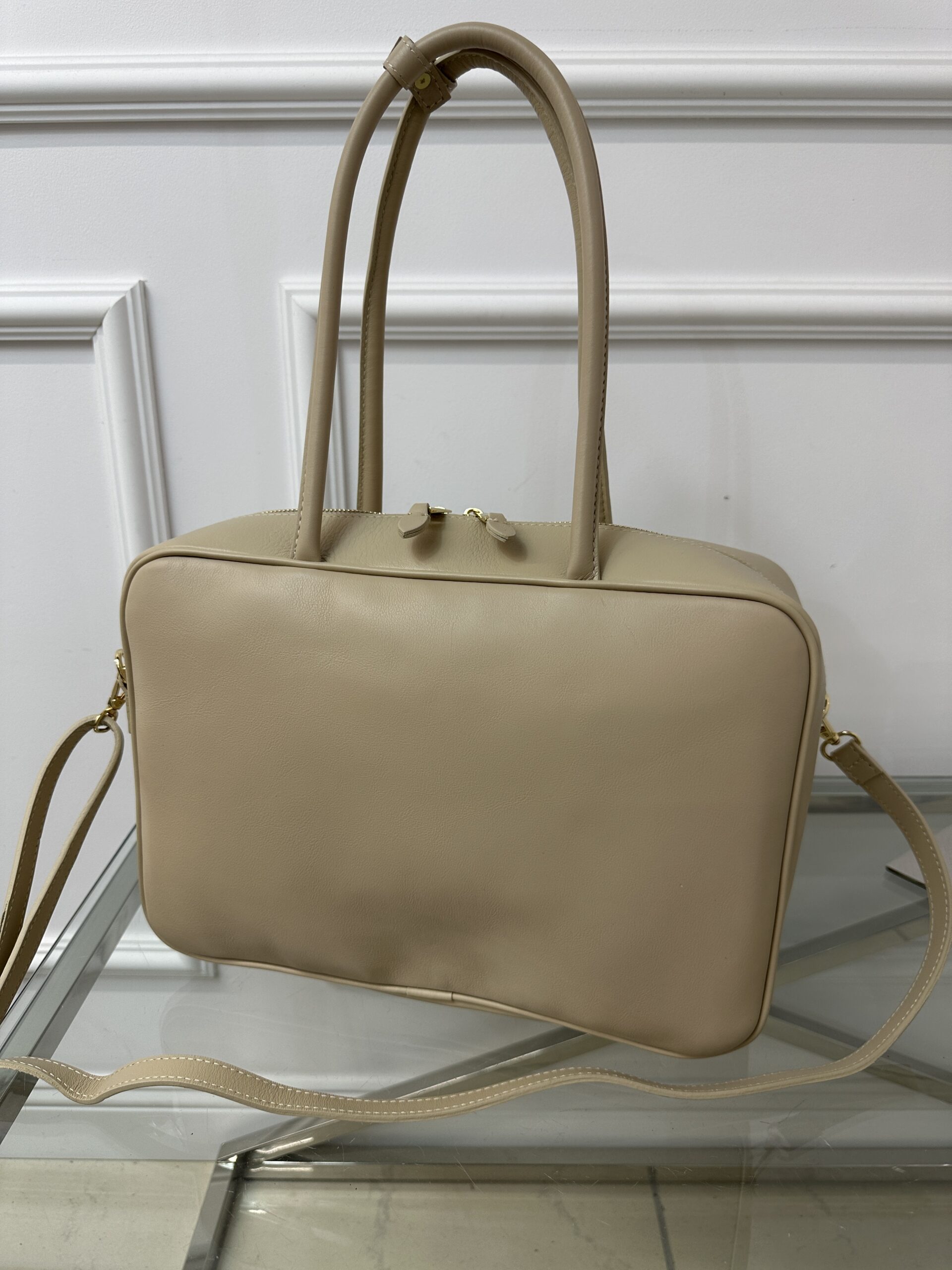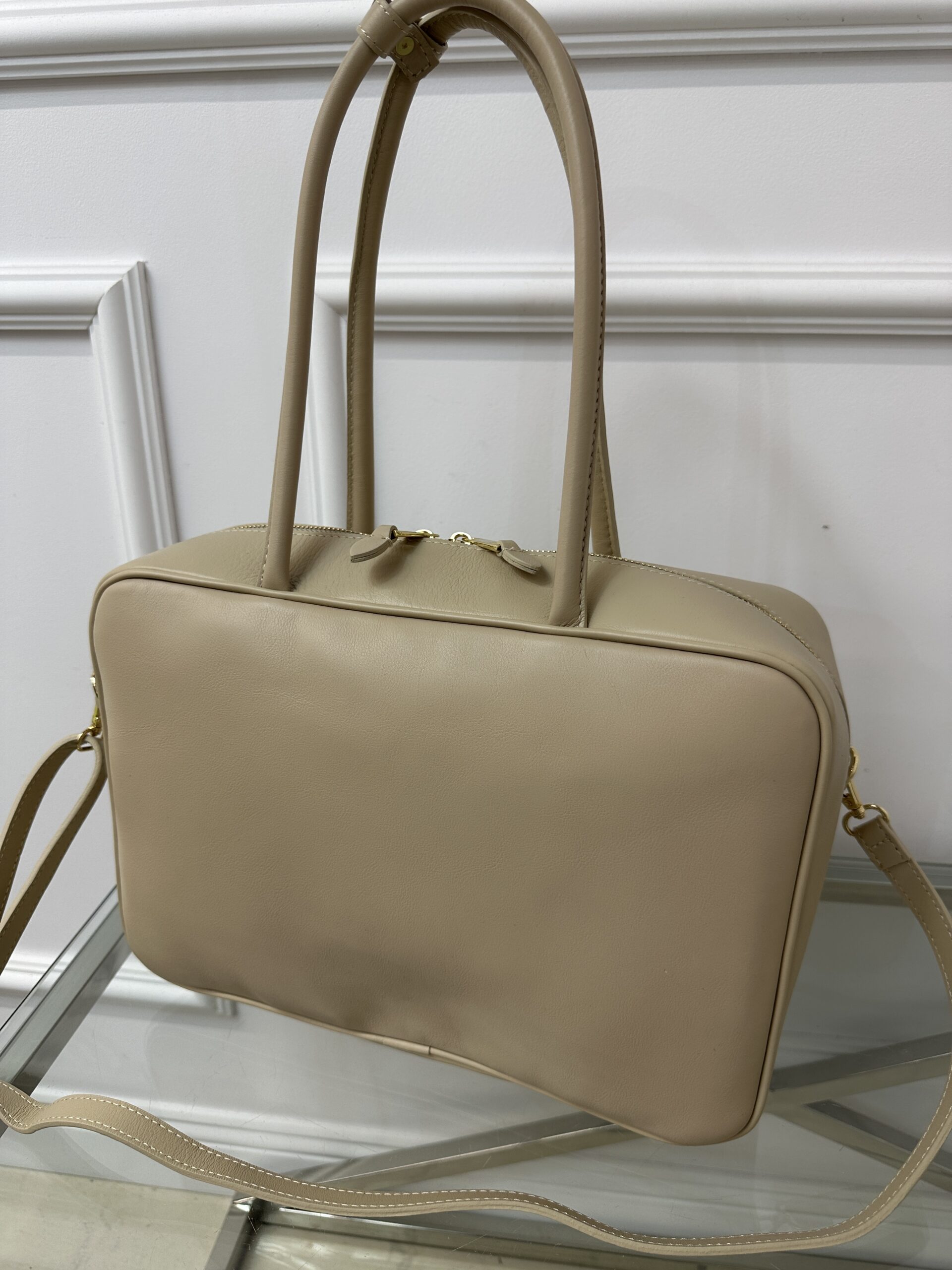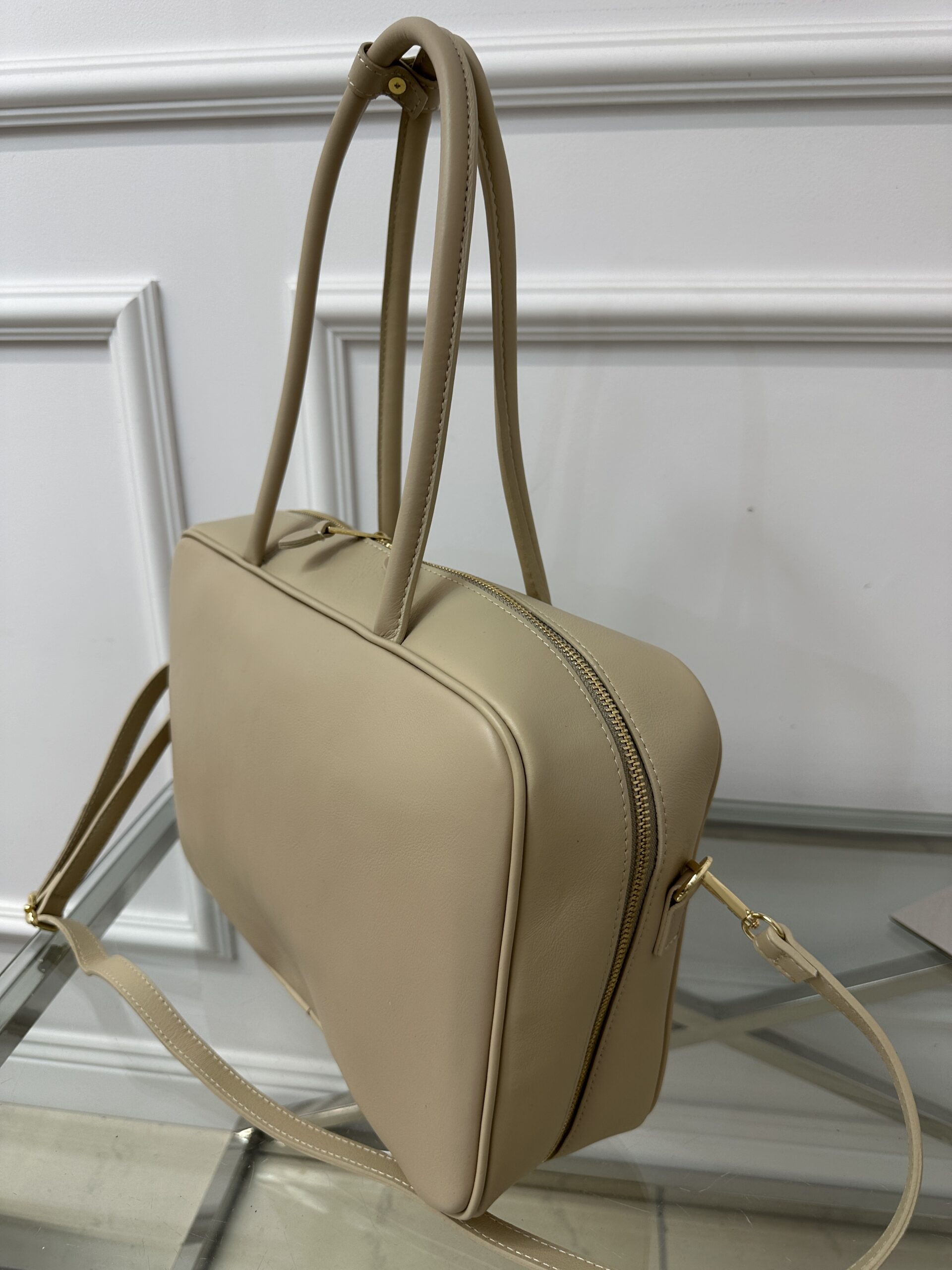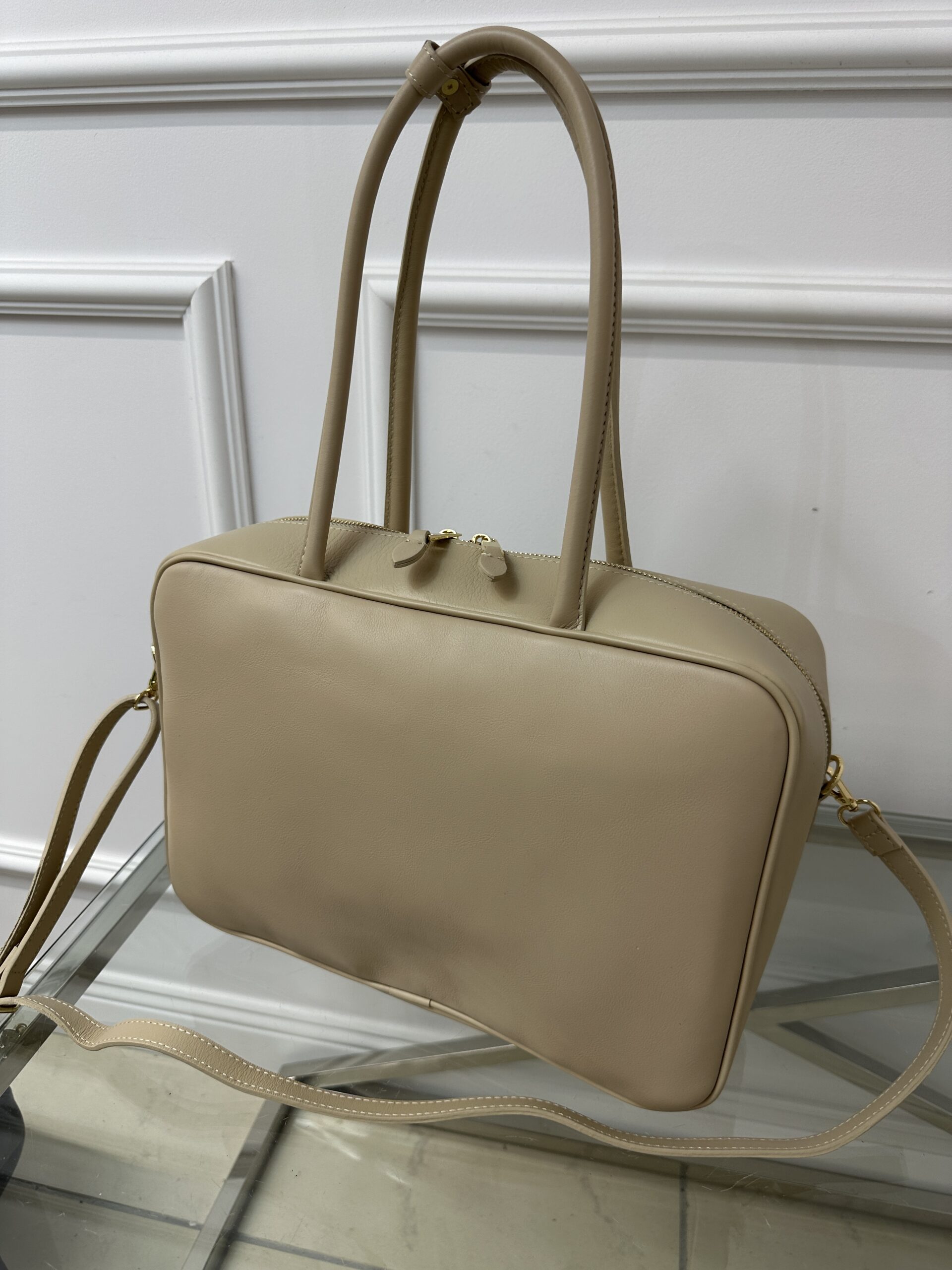 Efektowna torebka typu shopper wykonany ze skóry naturalnej gładkiej w kolorze beżowym , wewnątrz torebki jest jedna komora zamykana na suwak, kieszonka na telefon, okucia w kolorze złotym. Torebka posiada wygodne skórzane uszy i cienki skórzany pasek mocowany po bokach torby.