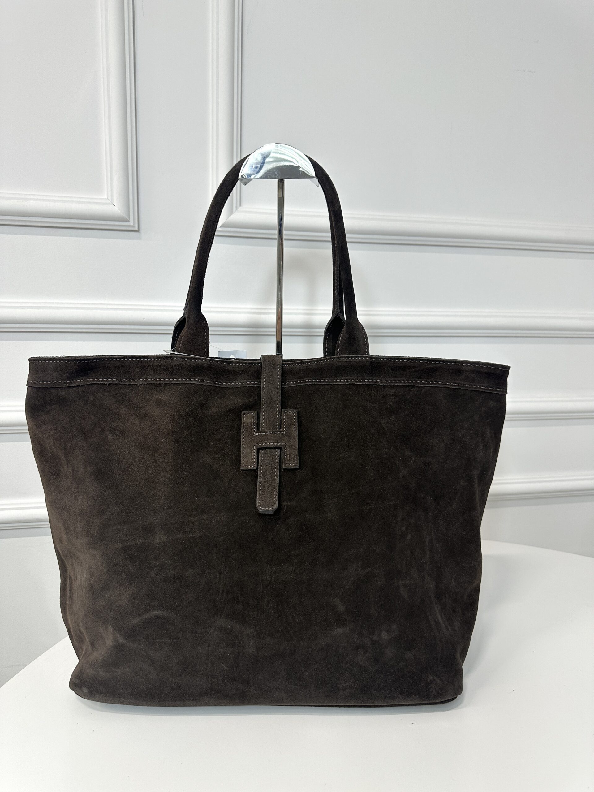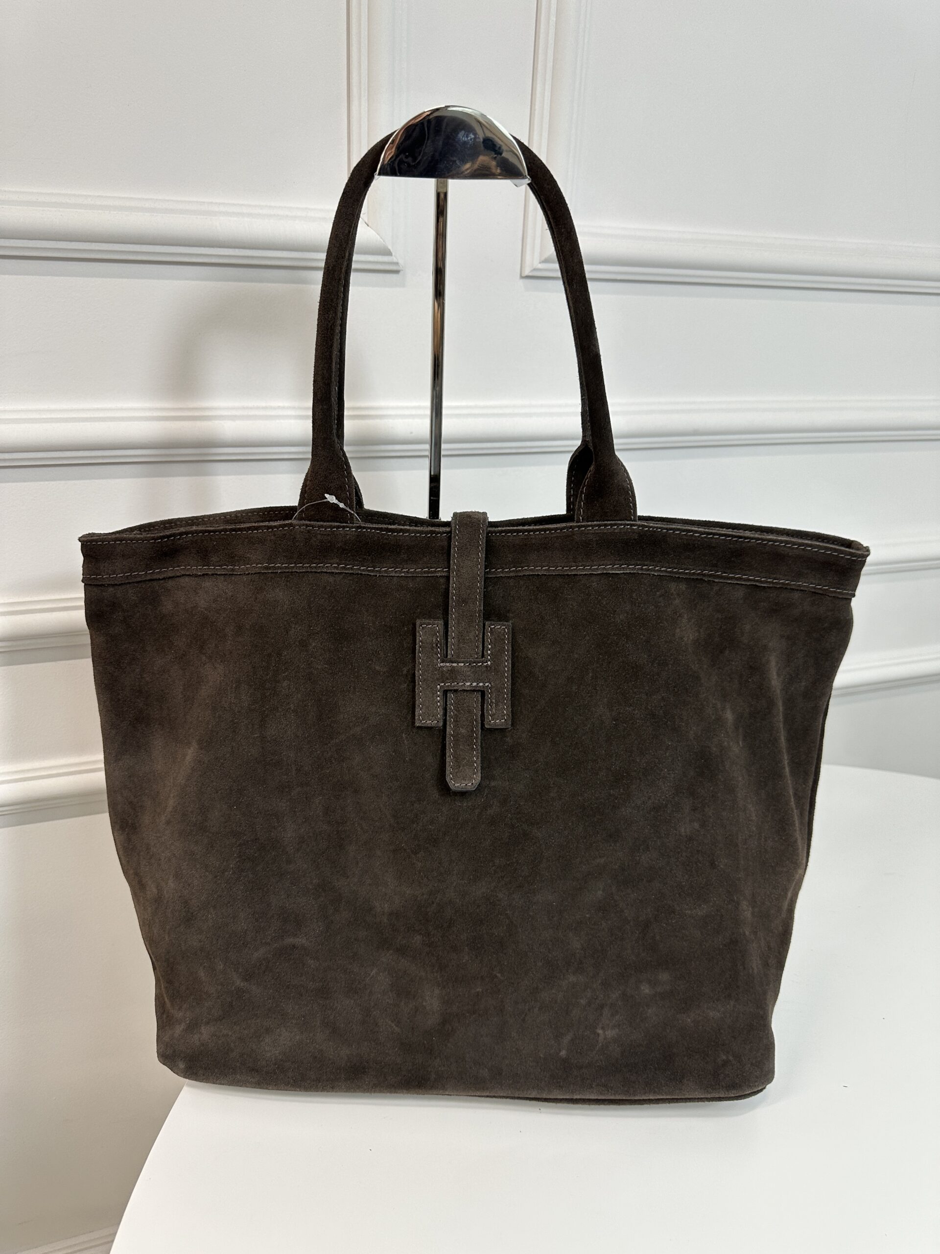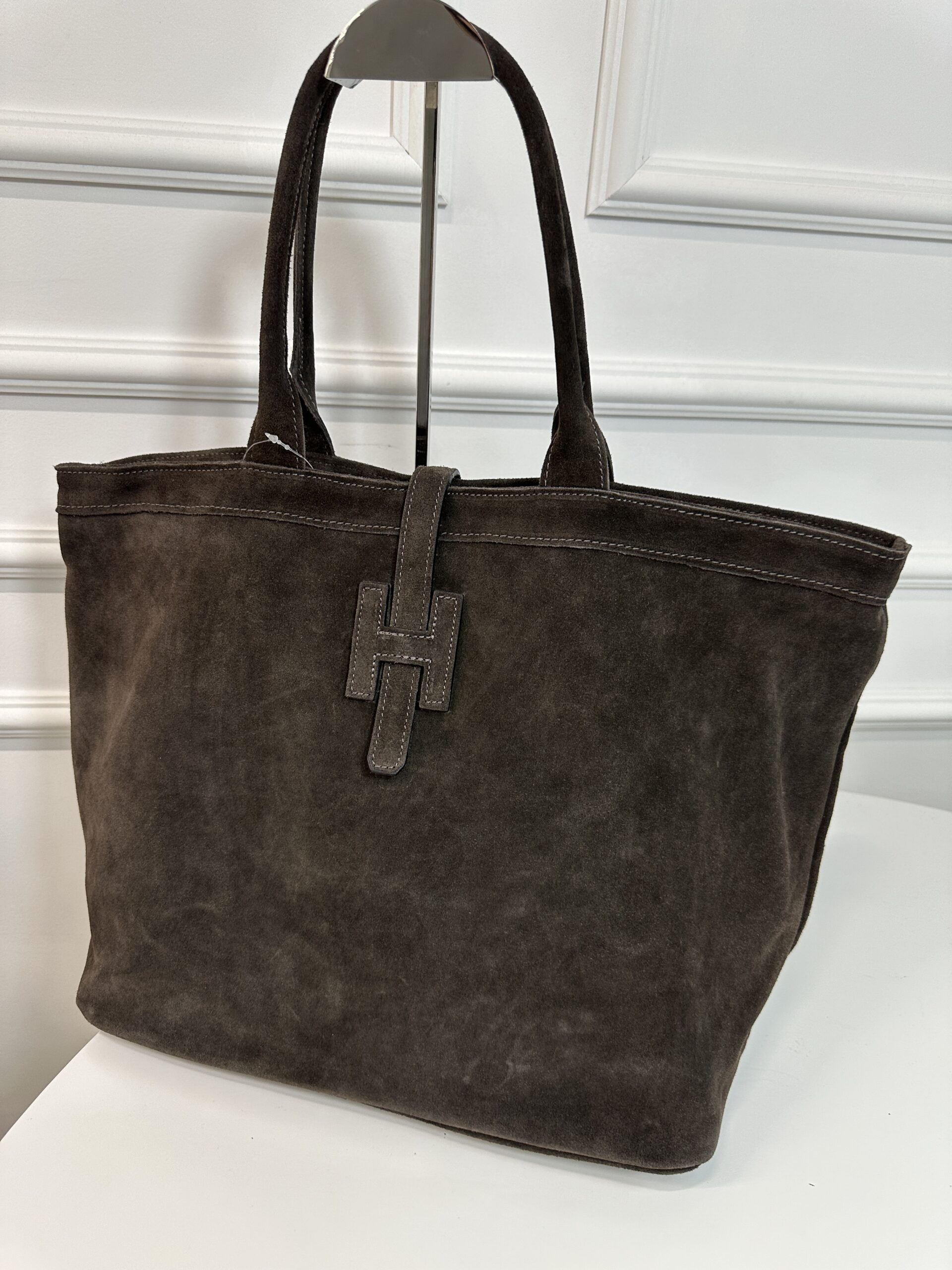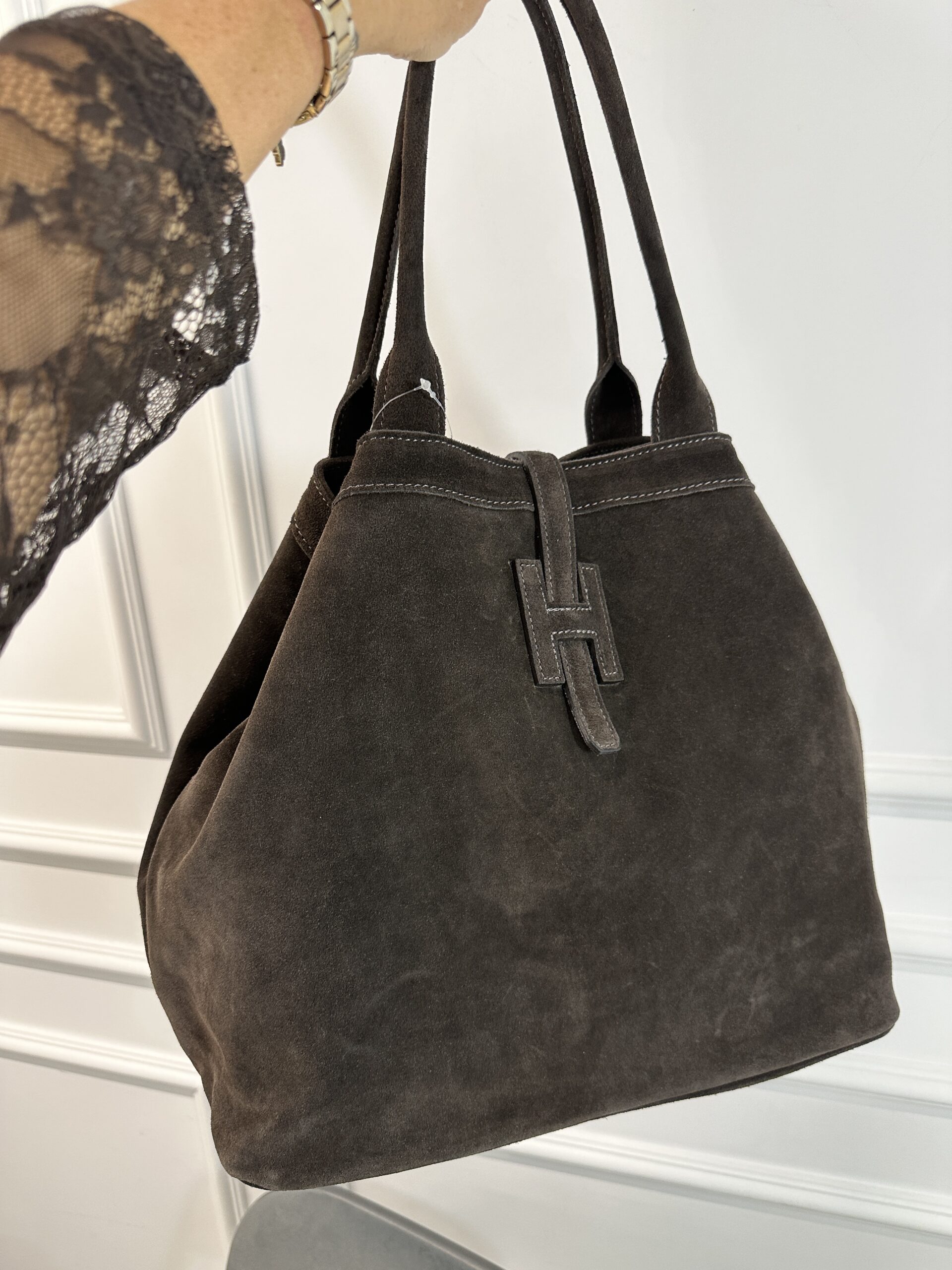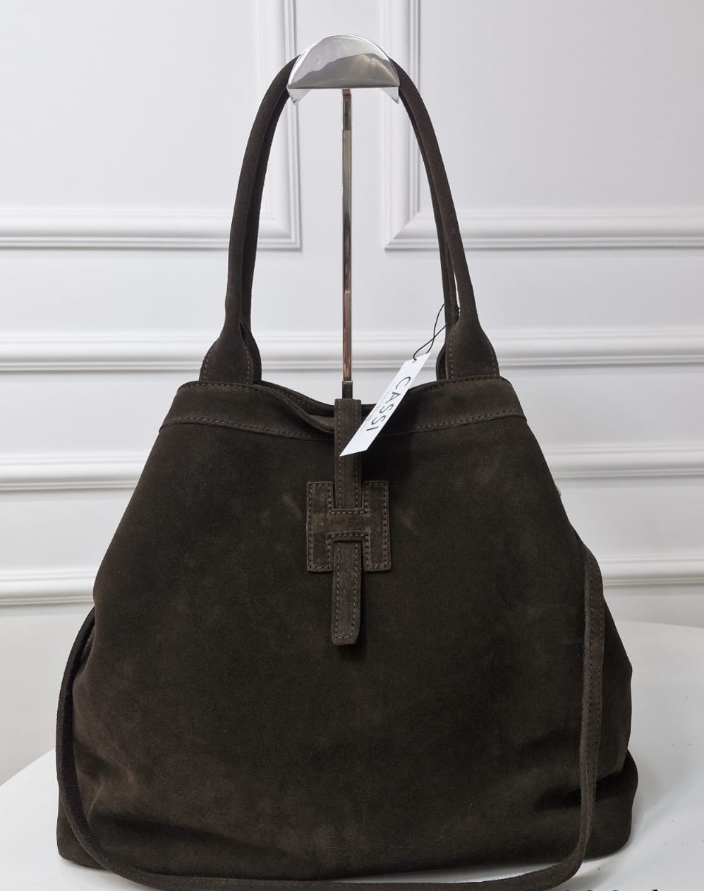 Elegancka modna torba , wykonana z zamszu w kolorze czekoladowym z dekoracyjną literką z na froncie . Torebka nada każdej stylizacji klasy i szyku . Mieści format A4 podręczny i funkcjonalny. Wnętrze składa się z obszernej komory z kieszonką na telefon lub drobiazgi. Okucia w kolorze złotym. Torebka posiada wygodne rączki zamszowe do noszenia zamszowy pasek.