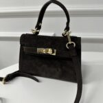 Elegancka torba wykonana z naturalnej skóry zamszowej w kolorze brąz . Ma klasyczny fason – szeroki dół i lekko zaokrągloną górę, co daje jej kobiecego charakteru. Torebka posiada dwie skórzane rączki i regulowany pasek. Model zamykany na obrotową klamrę, w środku posiada odpinaną saszetkę z praktycznym zapięciem na suwak wykonana z materiału. Charakteru torebce dodaje czerwona podszewka.