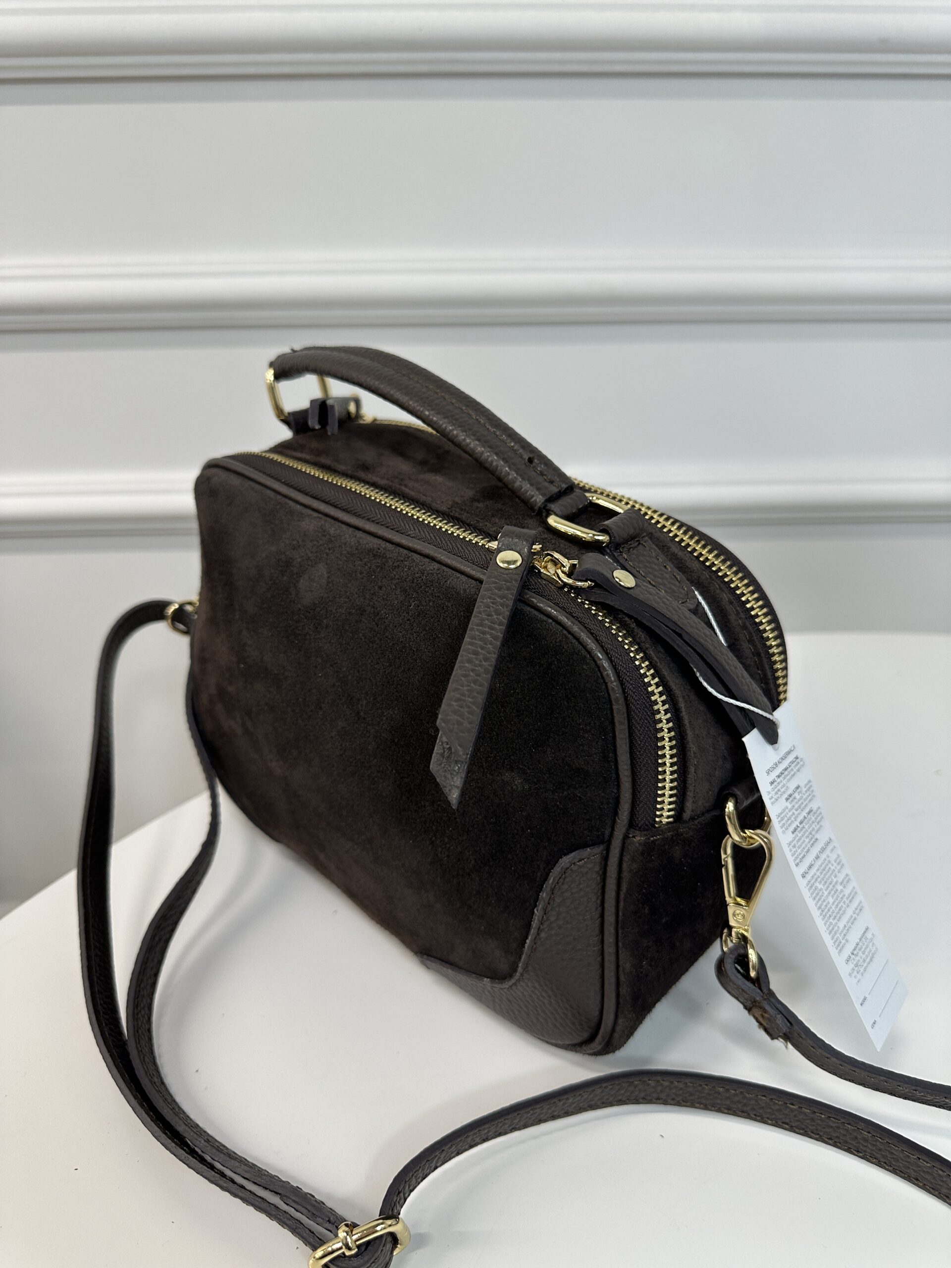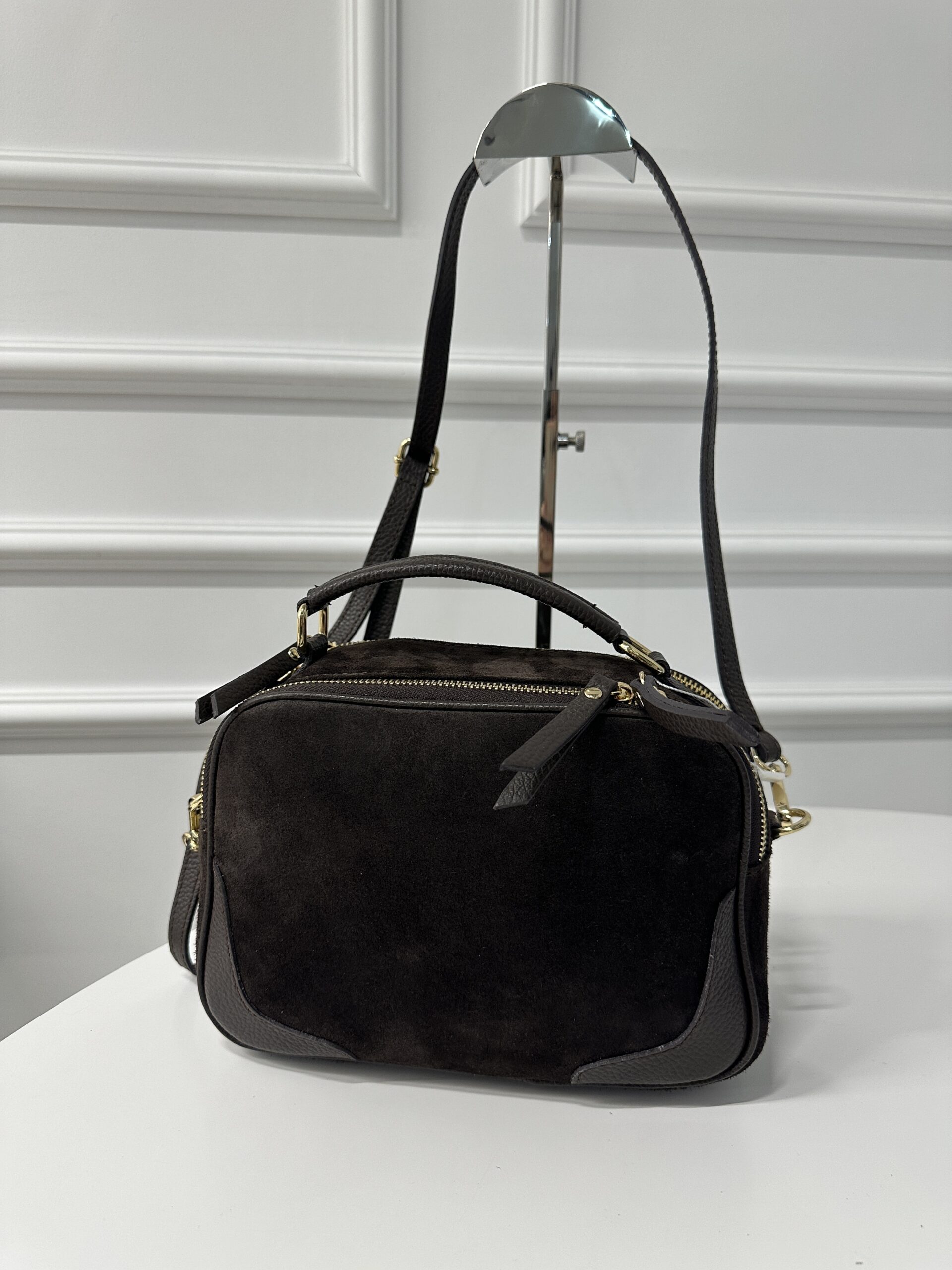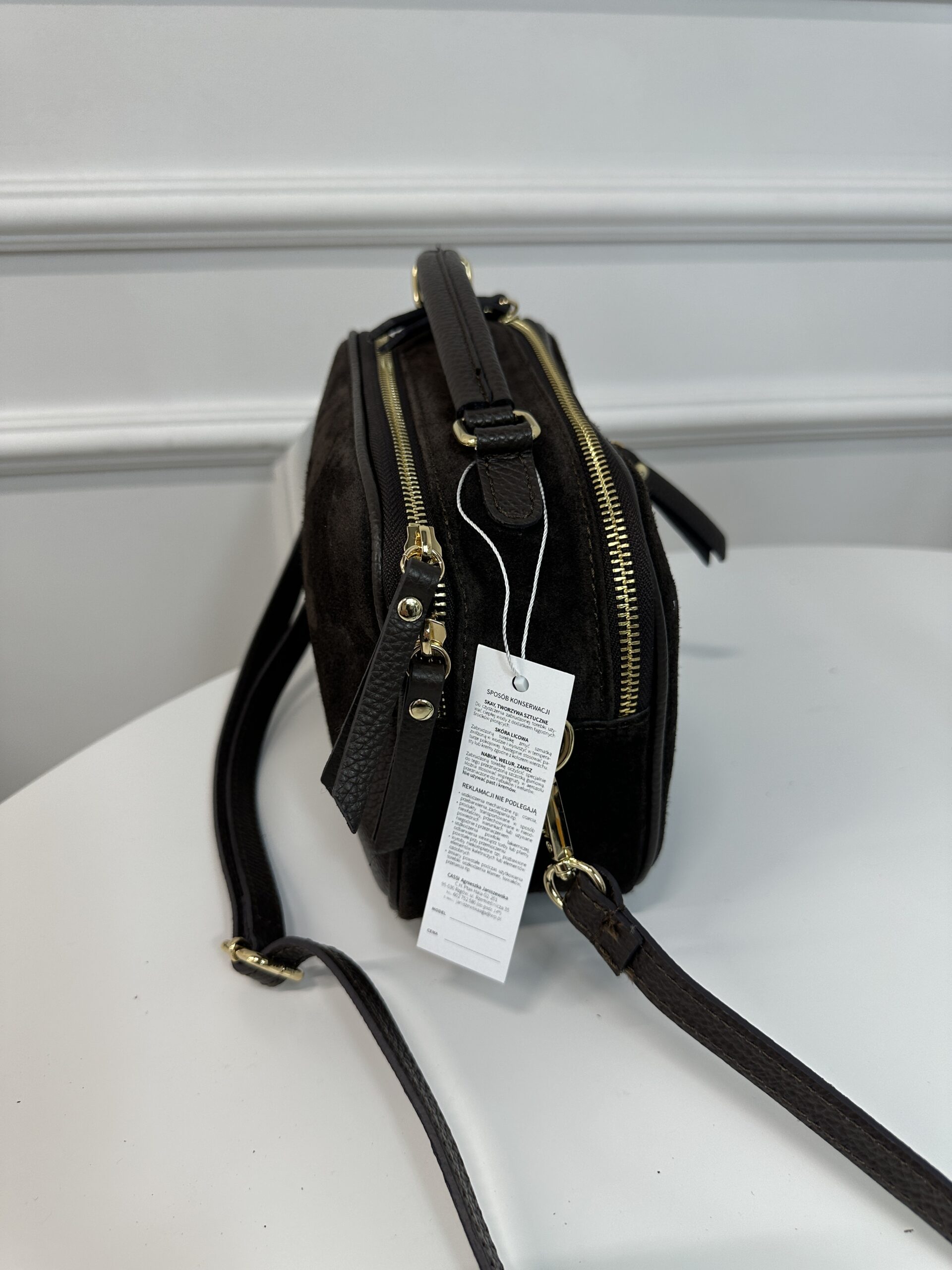 Torebka zamszowa z dodatkami ze skóry licowej. Ten model idealny jest dla kobiet ceniących połączenie stylu i wygody.Torebka wykonana z wysokogatunkowej skóry zamszowej , urzeka swoją miekką strukturą,zapwewnia komfort użytkowania na co dzień, posiada dwie kieszenie. Mały rozmiar sprawia że jest niezwykle poręczna z subtelne wykonczenia suwaków dodają eleganckiego charakteru. Idealna na każdą okazję.