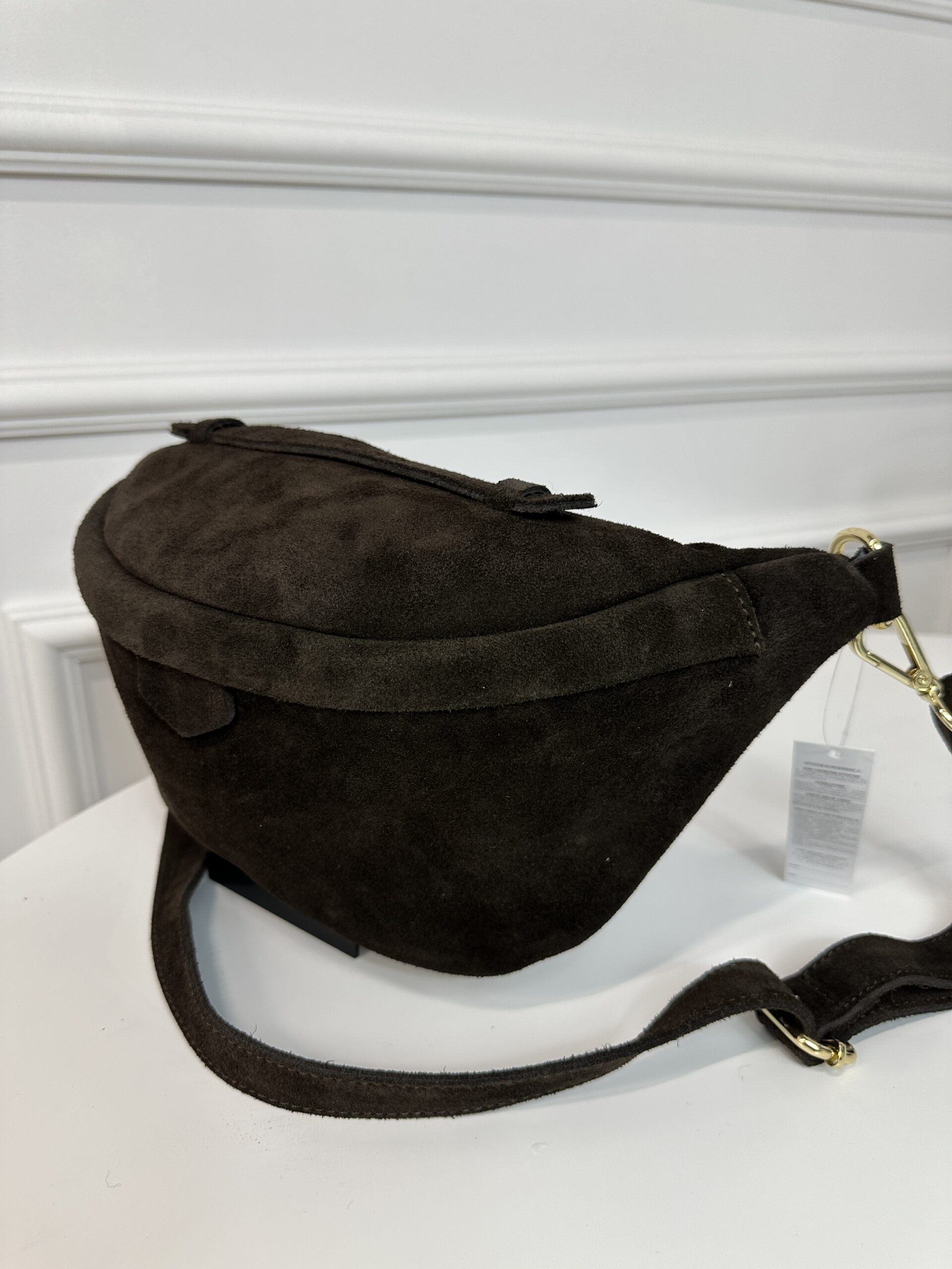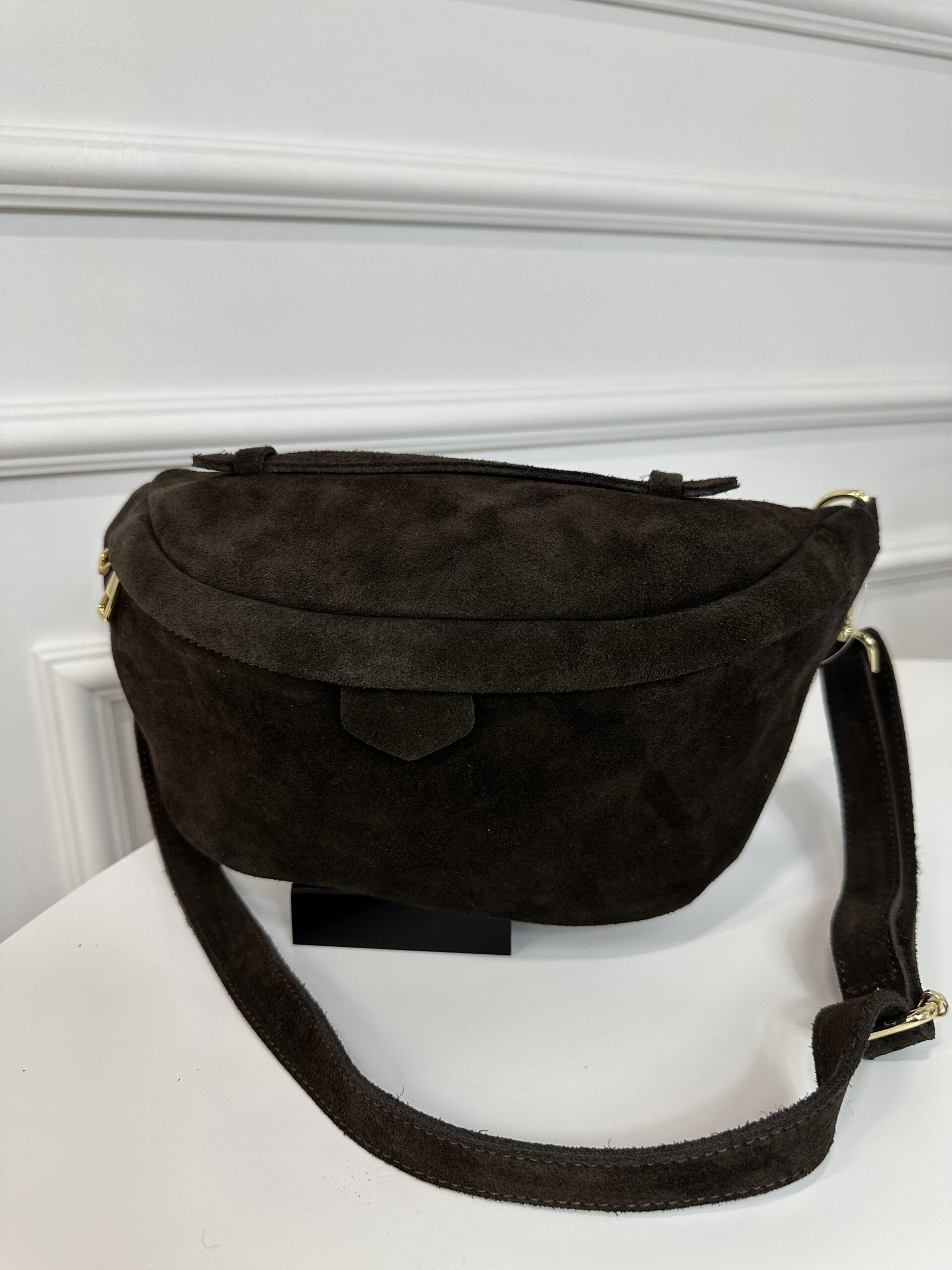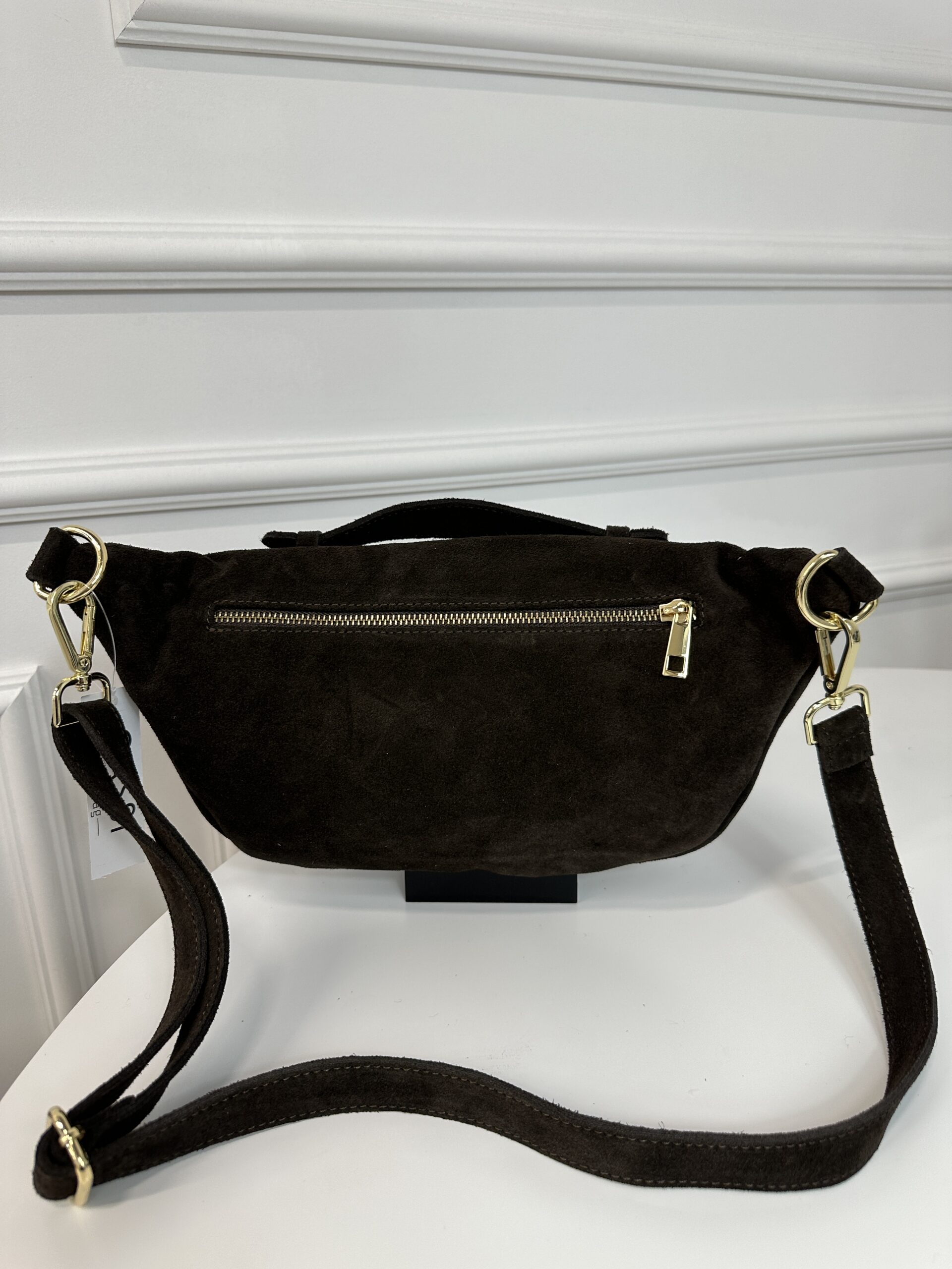 Hitowy model torebka typu nerka duża wykonana ze skóry zamszowej w kolorze czekoladowym .Wewnątrz znajdują się dodatkowo kieszonka zapinana na suwak. Nerka posiada pasek z regulacją długości i rączkę na froncie torby, okucia w kolorze złotym. Nerka jest niezwykle pojemna i wygodna, można ją nosić do sportowych stylizacji jak i na skos tak jak listonoszkę. Niezastąpiona jako casualowy dodatek.