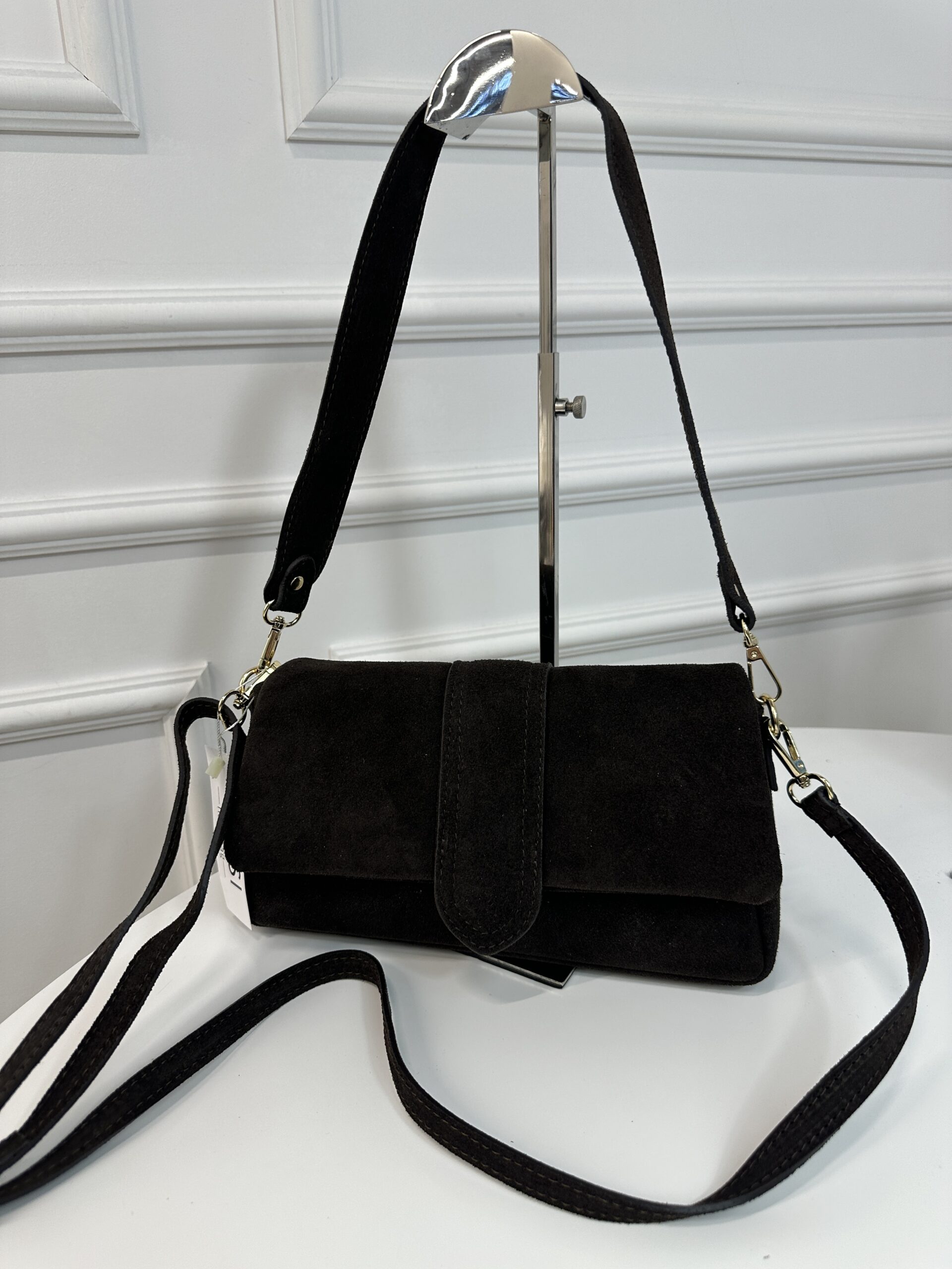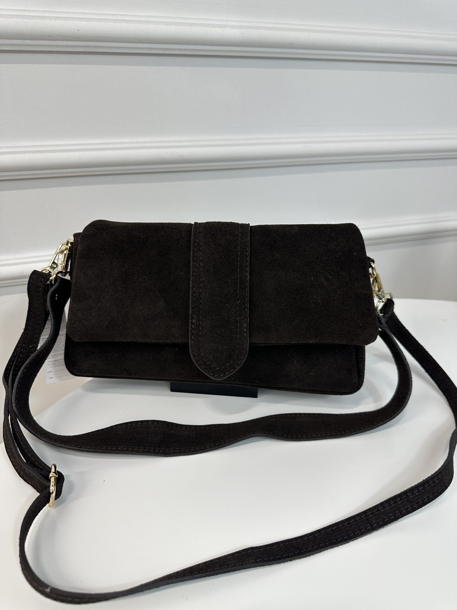 Skórzana torebka – absolutny hit .Torebka wykonana ze skóry zamszowej . Torebka zapinana na nap pod klapa. W środku jedna kieszeń . Regulowany pasek zamszowy . Torebka oprócz telefonu zmieści mały portfel jest niezwykle pakowana i pięknie odszyta .Z tyłu torebki pieczątka z nazwą marki Cassi i mała kieszonka na drobiazgi. Torebka posiada dwa paski jeden może posłużyc jako rączka i długi cienki zamszowy pasek.