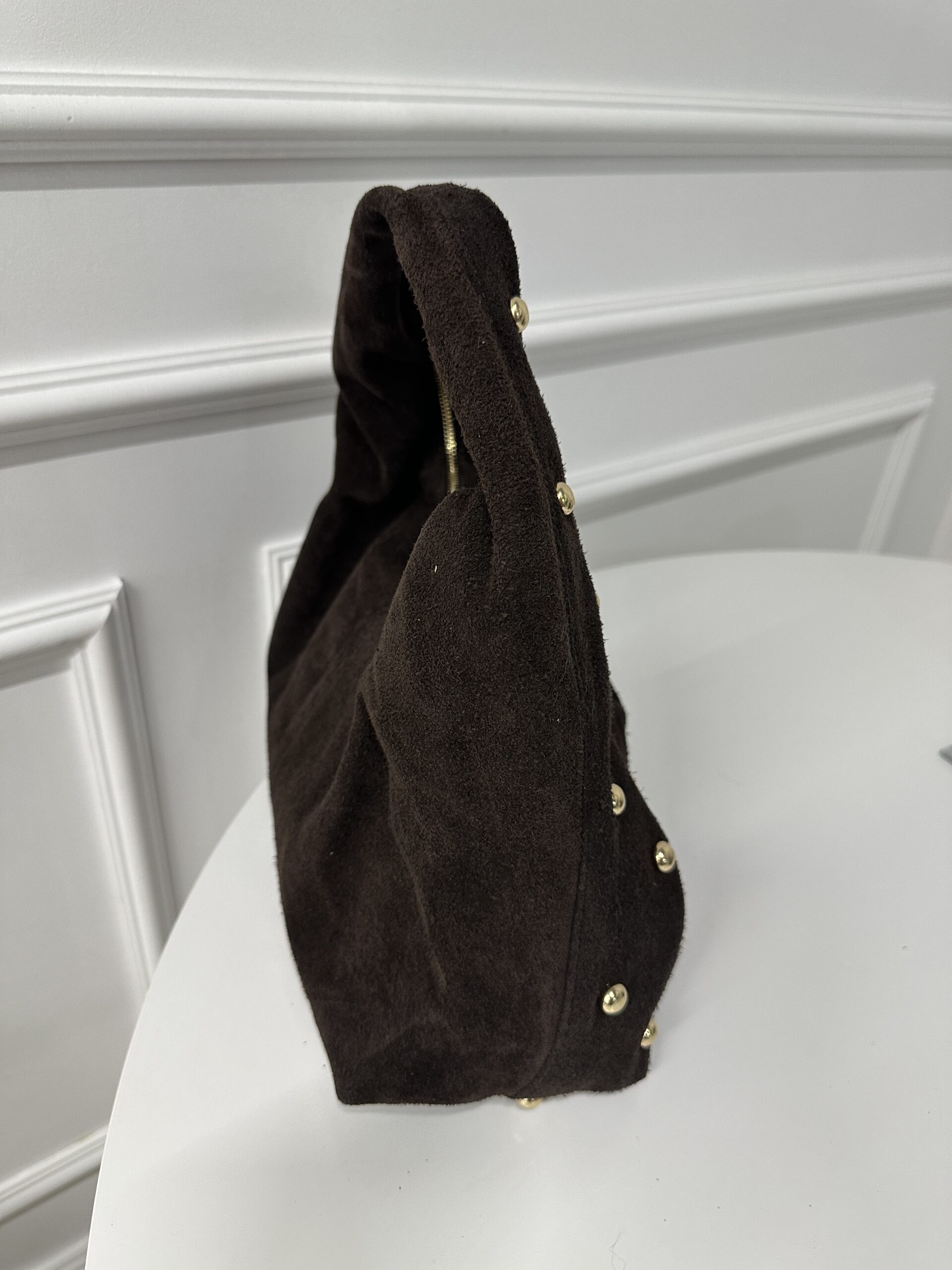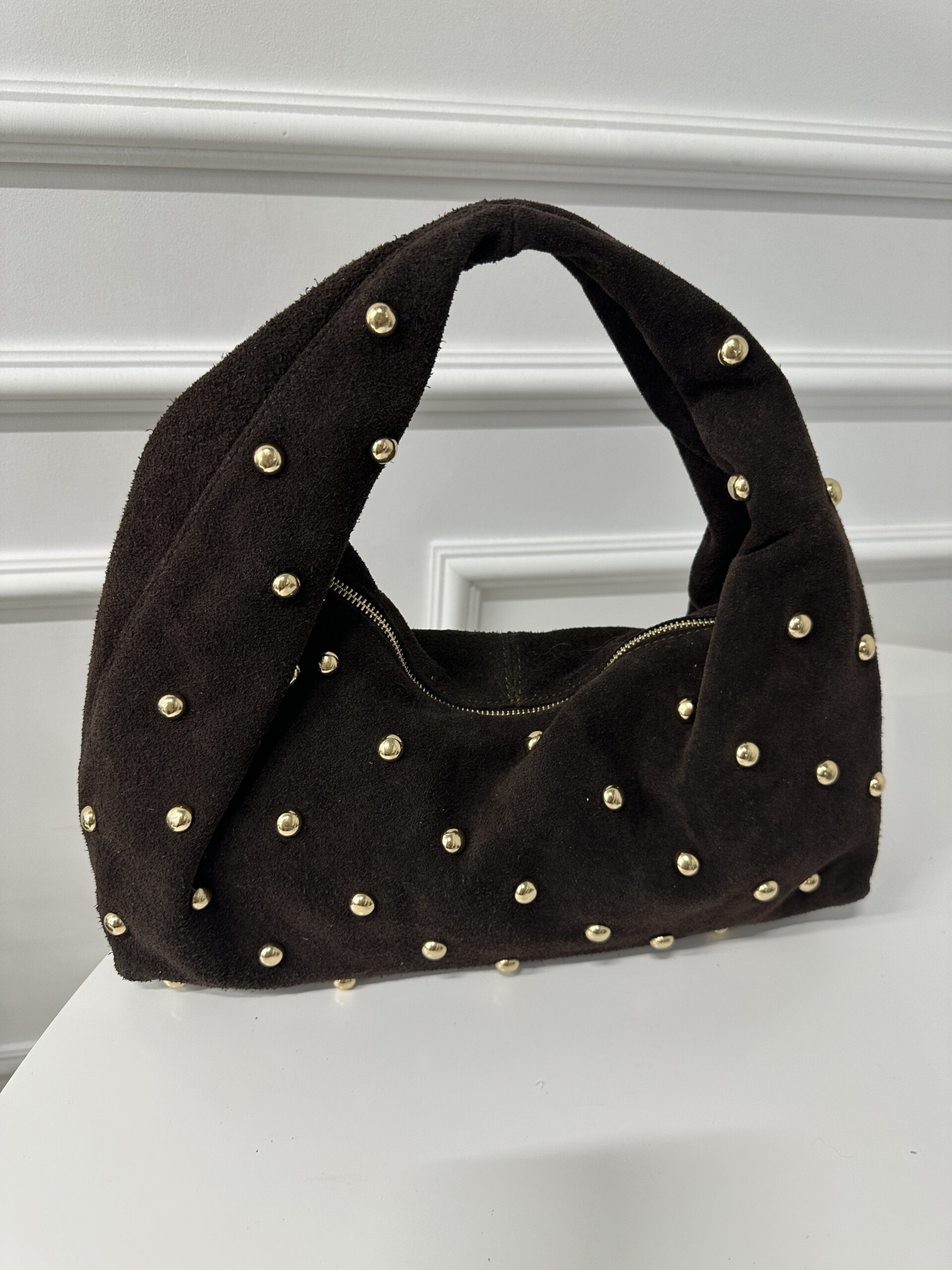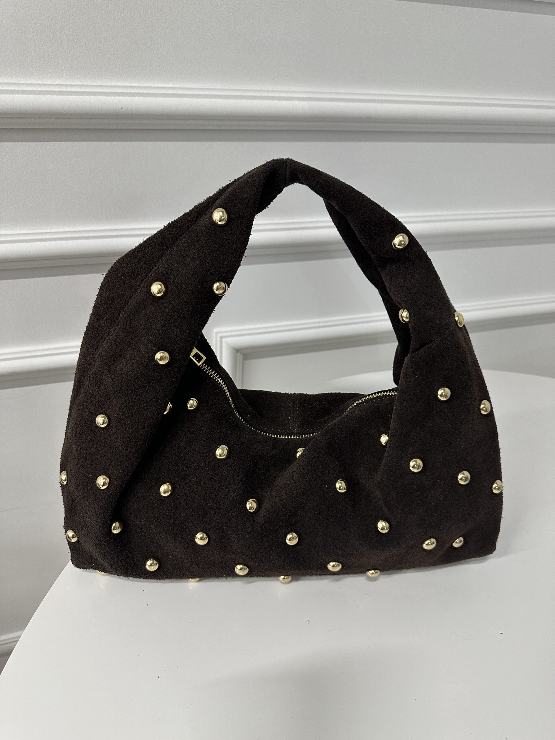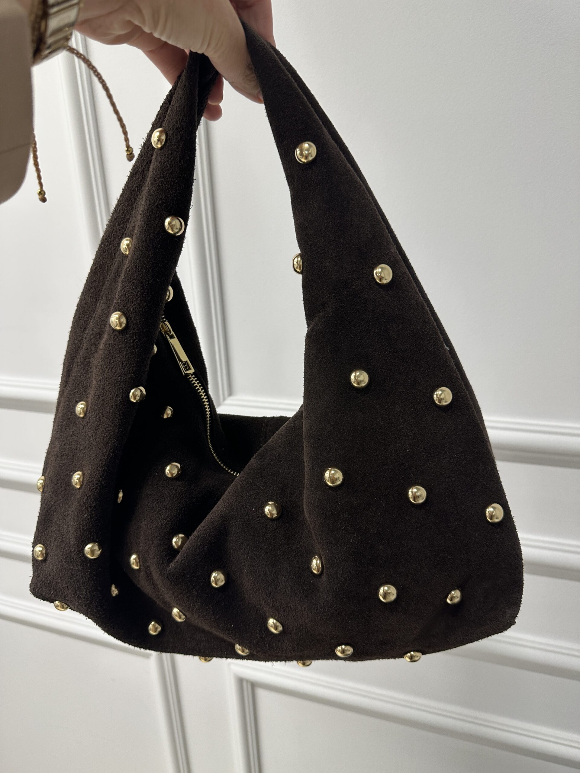 Zamszowa torebka półokrągła na ramię z ćwiekami