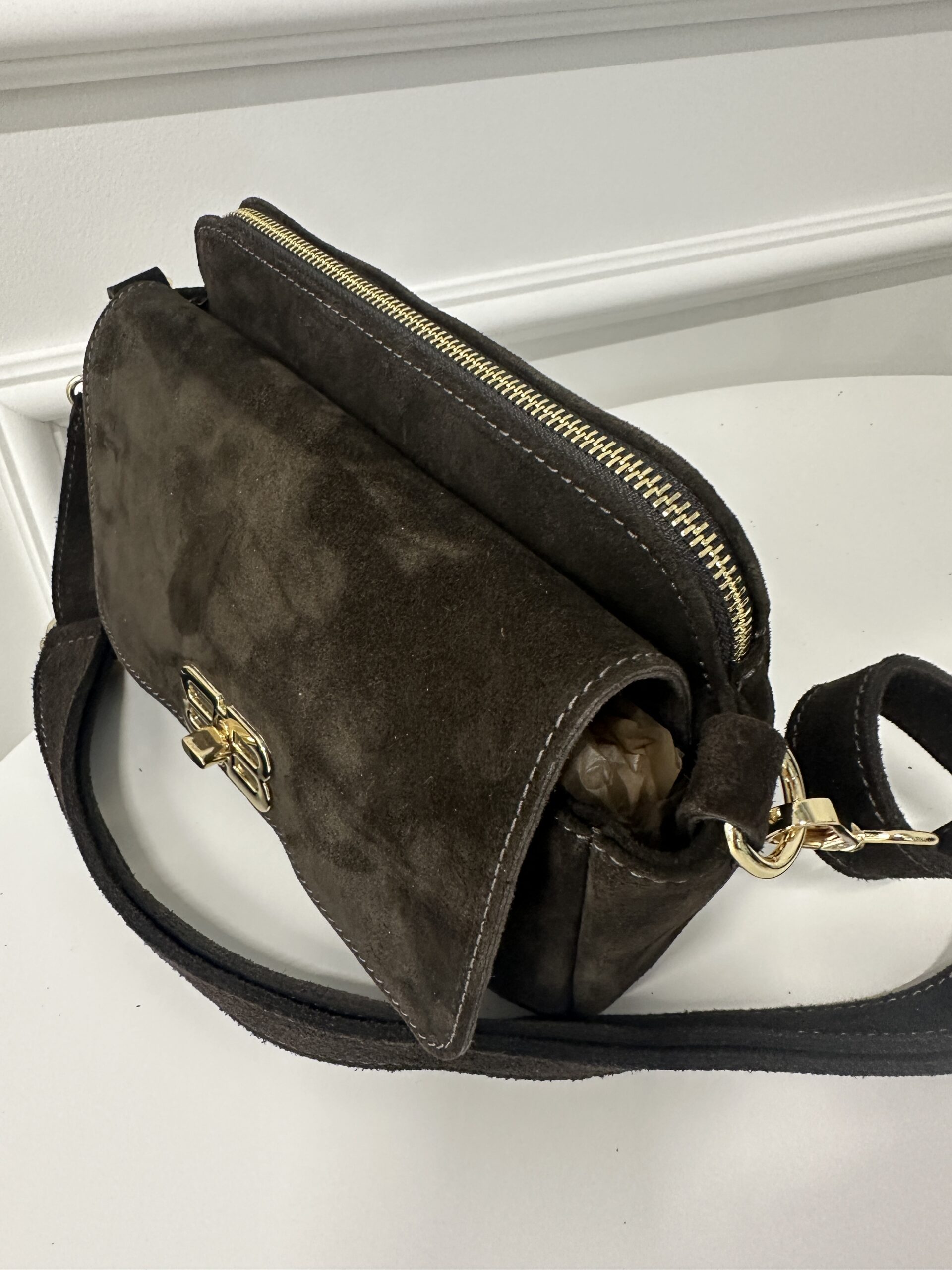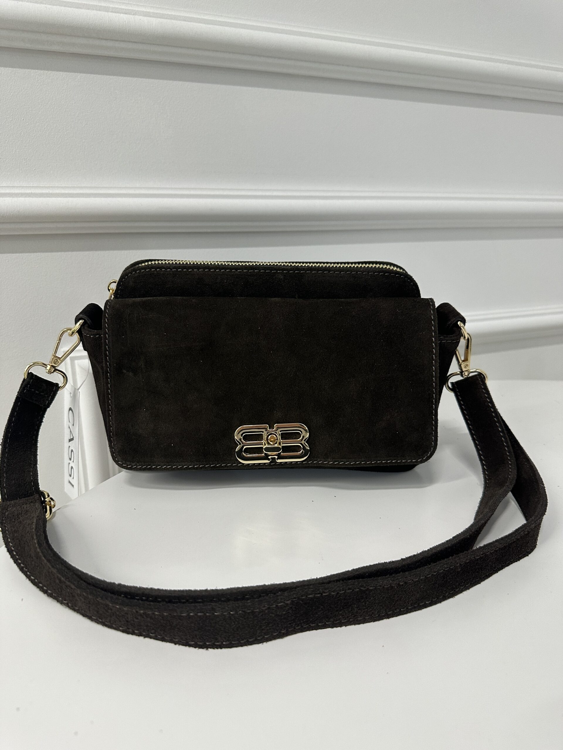 Zamszowa torebka z dekoracyjnym zapięciem – czekolada