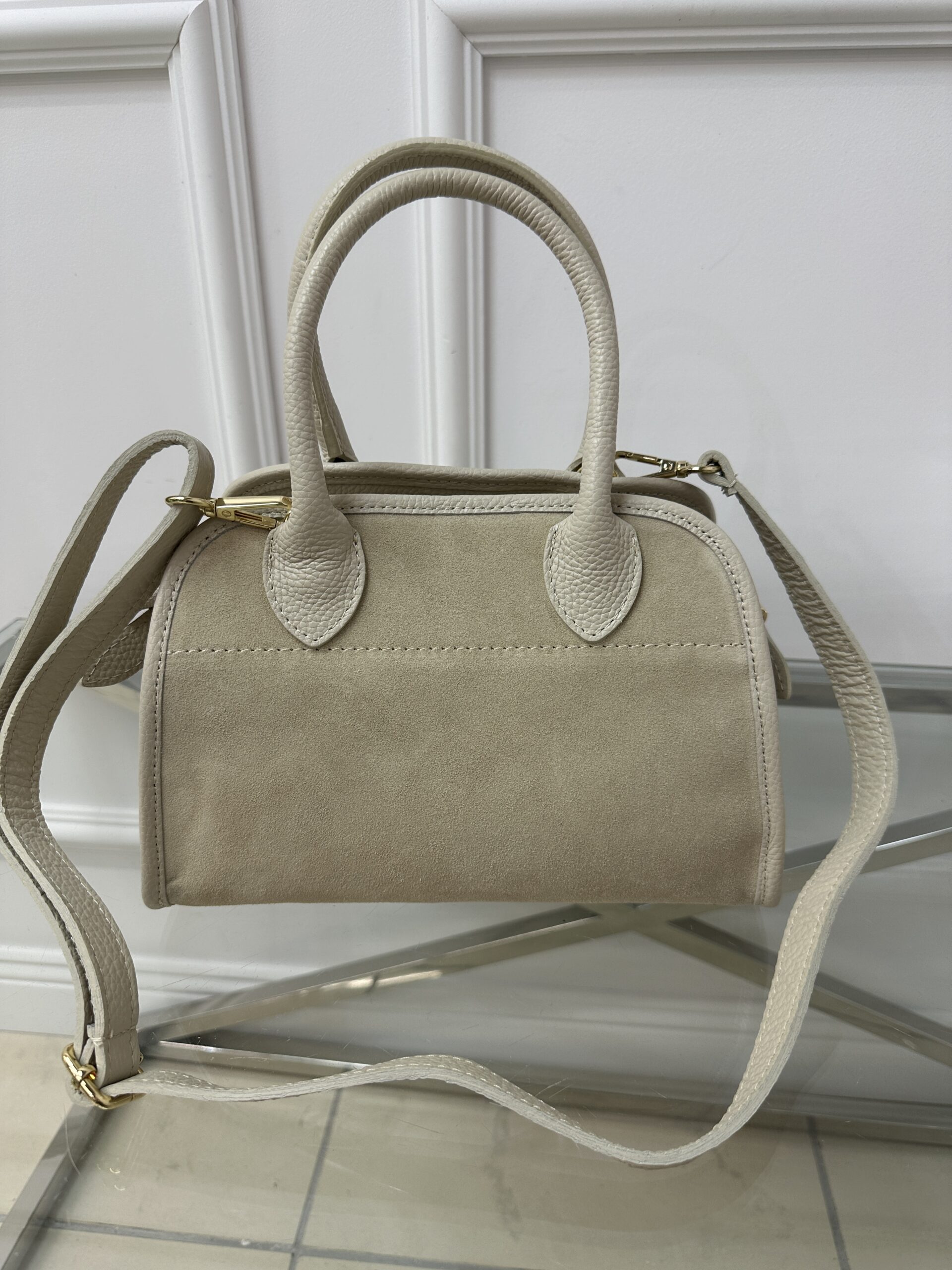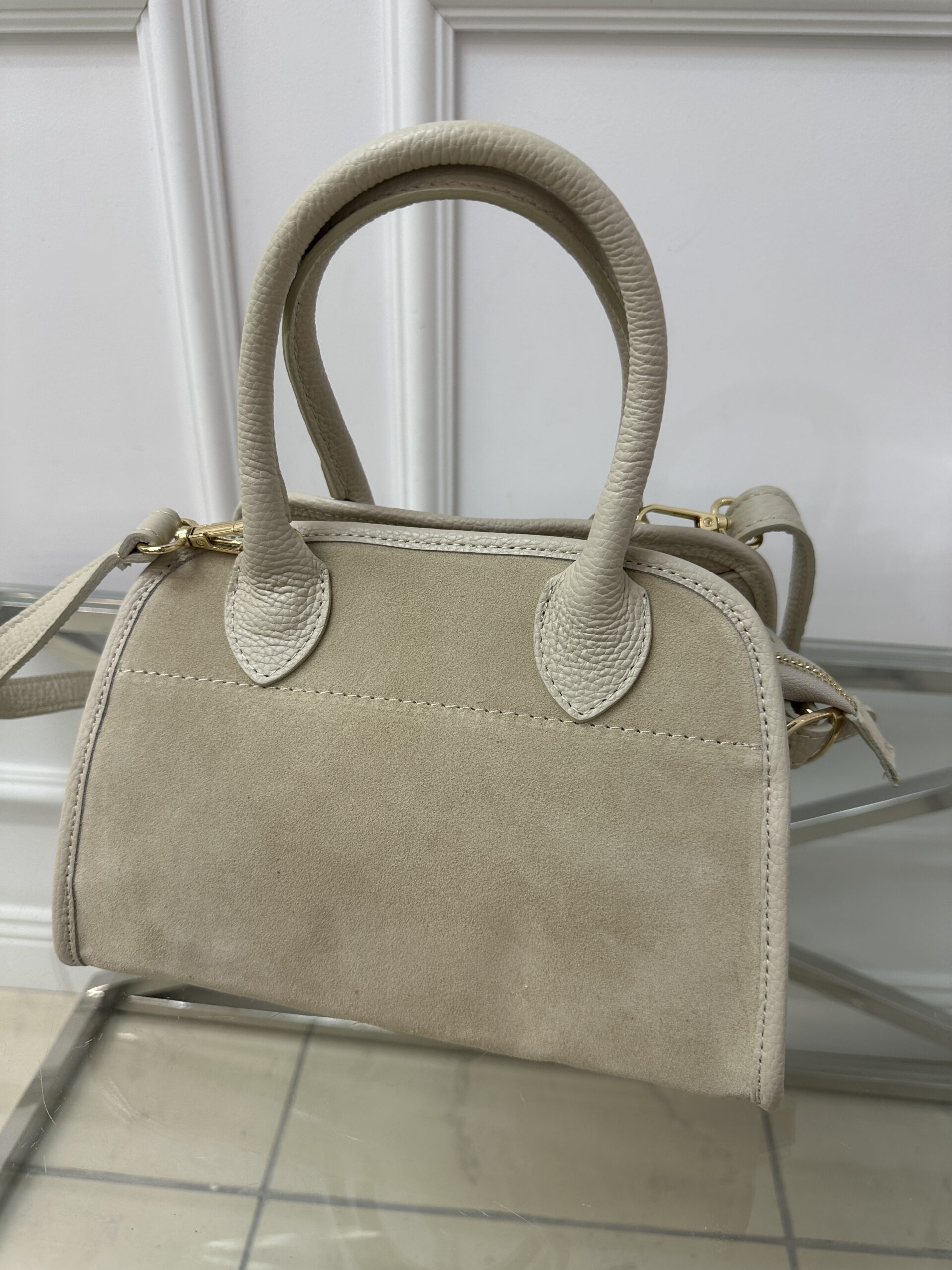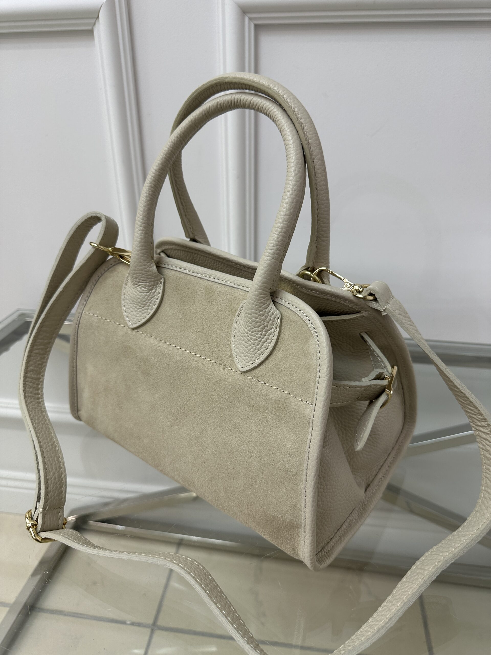 Zamszowy kuferek -rączki skóra