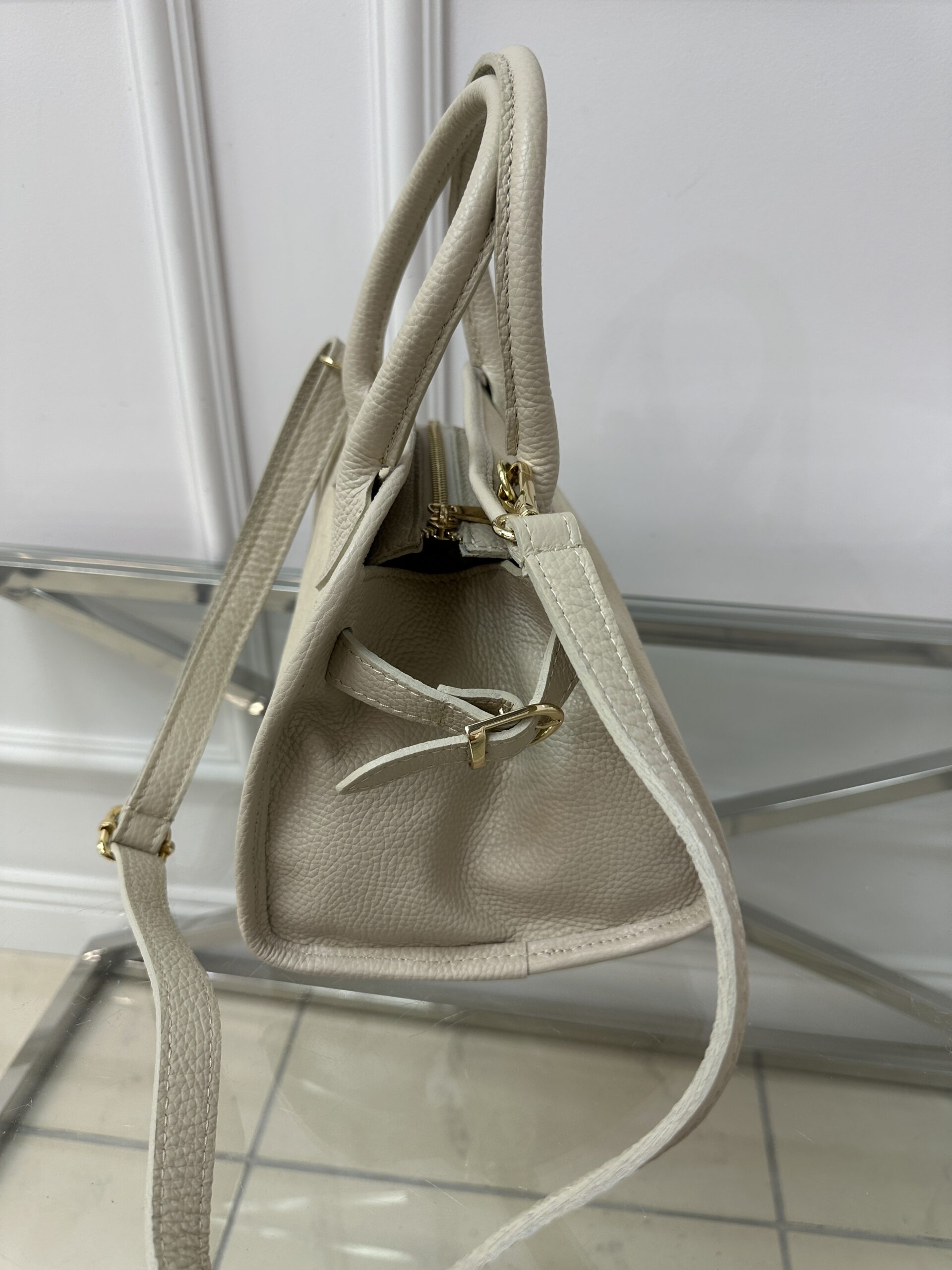 Torebka zapinana na suwak .Model ma wygodną rączkę wykonana ze skóry licowej. Regulowany pasek skórzany .Torebka jest niezwykle pakowana i pięknie odszyta , po bokach dekoracyjne klamry na zamszowych paseczkach które regulują pojemność kufra . Okucia w kolorze złotym. Wewnątrz znajduje się kieszonka na suwak. Model doskonale wykonany z dbałością o każdy szczegół.